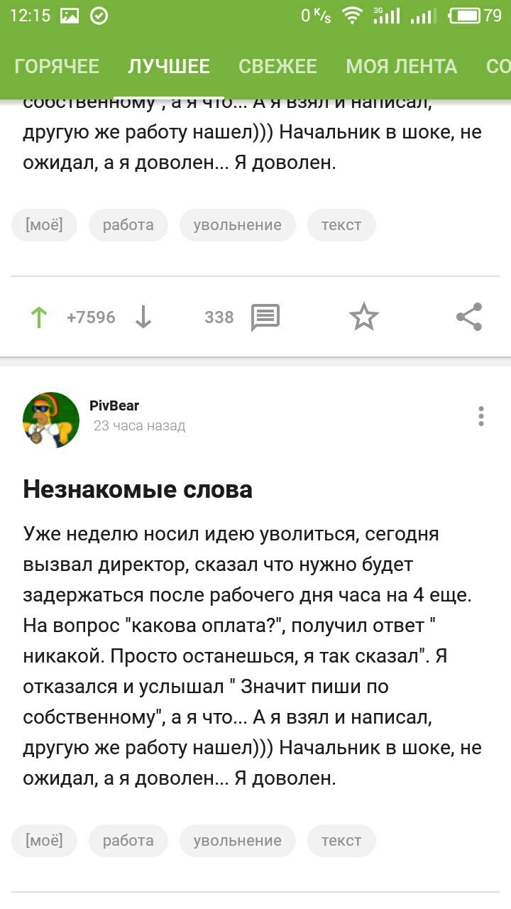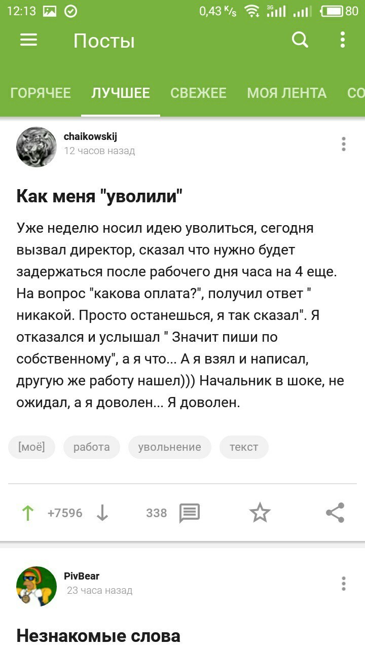 Уже неделю носил идею уволиться, сегодня вызвал директор, сказал что нужно будет задержаться после рабочего дня часа на 4 еще. На вопрос "какова оплата?", получил ответ " никакой. Просто останешься, я так сказал". Я отказался и услышал " Значит пиши по собственному", а я что... А я взял и написал, другую же работу нашел))) Начальник в шоке, не ожидал, а я доволен... Я доволен.
