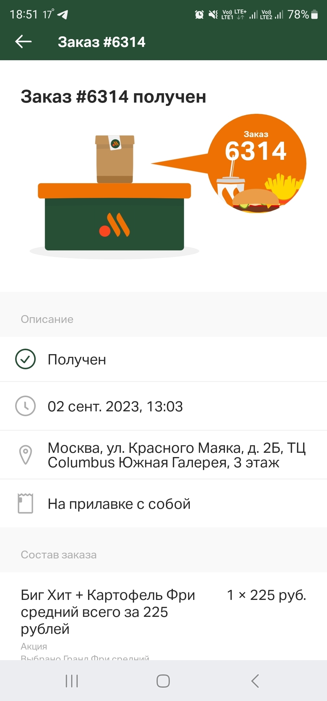 Жду ради интереса до 13:07, ничего не происходит. Што ш, кушоть хочется, время капает. Делаю новый заказ, оплачиваю, получаю, ухожу.