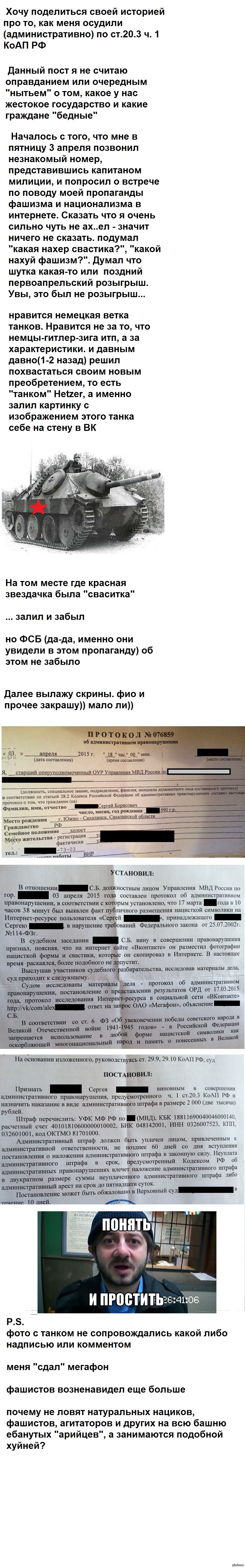 Мужик. Ты зря услугами адвоката не воспользовался. Если у тебя не было нацистских лозунгов, и призывов к национализму и не восхвалялся фашистский режим - то какая нахуй пропаганда фашизма может быть? Это чистый развод на незнании своих прав и неумении защитить себя. Просто кому то личный плюсик в карьере. Иди к адвокату, консультируйся, и обжалуй решение суда. Потому что нехуй фабриковать дела на пустом месте. Хотят сделать себе хорошую статистику - пускай реальных нацистов ловят.