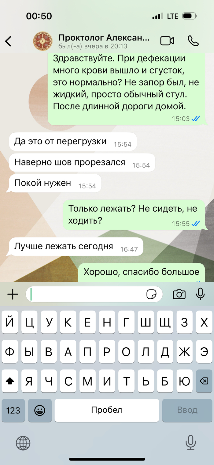 Доктор говорил, что людям с улусов тоже делают операцию и они чуть ли не в тот же день уезжают домой. Но я побыла еще 5 дней и поехала. По приезде опять сильная боль и поход в туалет по большому сопровождался большим количеством крови и ее сгустками.