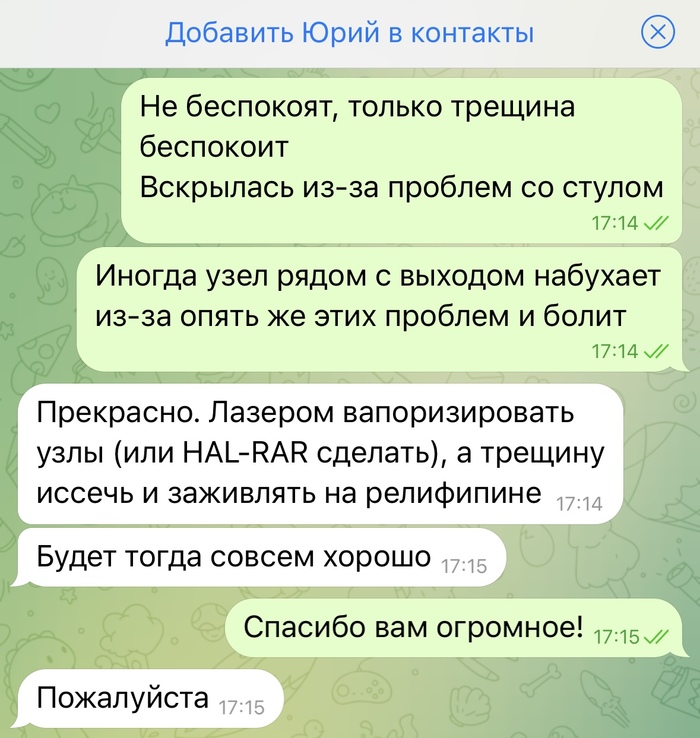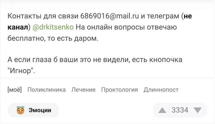 Врач попросил назавтра сдать анализы крови, ЭКГ и сказать ему, что я решила. Придя домой, я поискала проктологов на Пикабу. Нашла доктора.