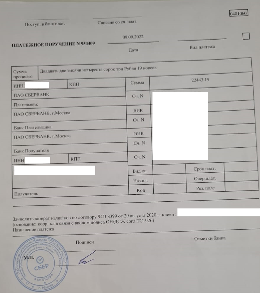 А потом произошло ЧУДО! В начале сентября Молча, без звонков и уведомлений просто на счет упали 22 000. Я сначало даже и не понял что это. Позвонил в СБЕР, спросил что это? Оператор никак не могла понять что это и откуда взялось. Поехал в отделение ножками, взял платежку с мастичной печатью а там (внимательно смотрим на основание платежа).