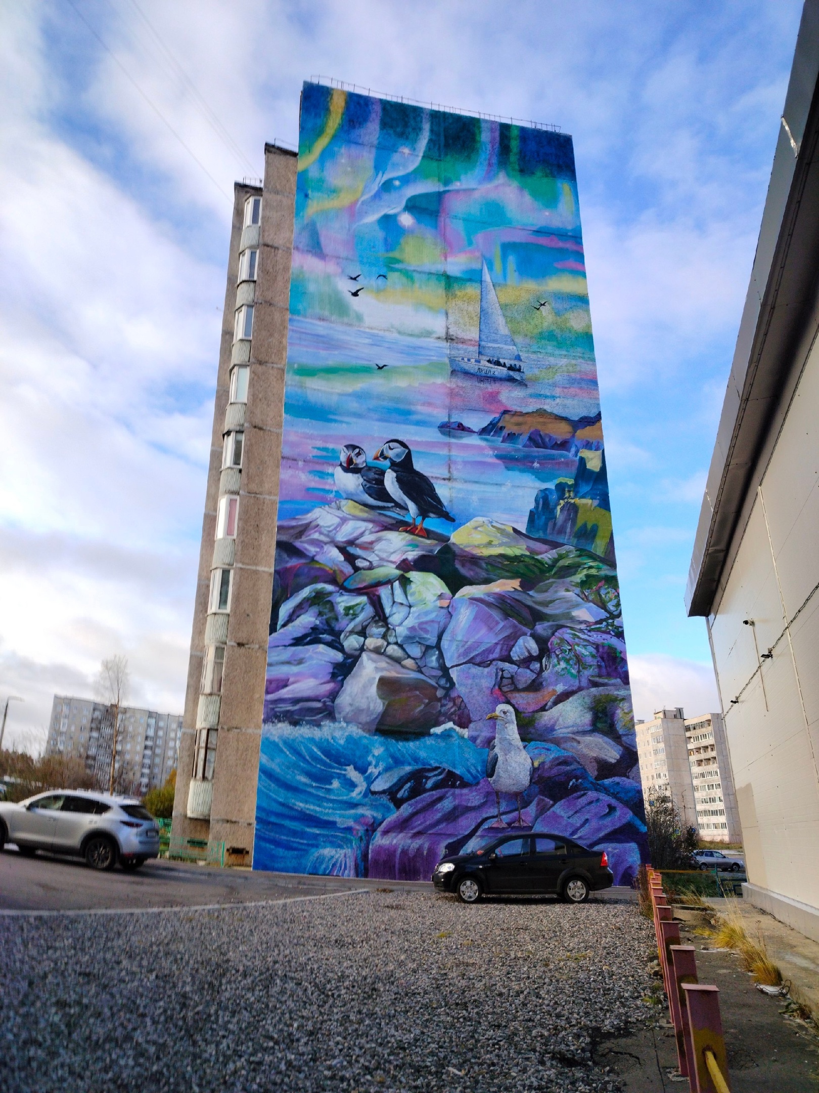 А от этого мурала веет чудом. Автор отразил через северное сияние все краски Заполярья.