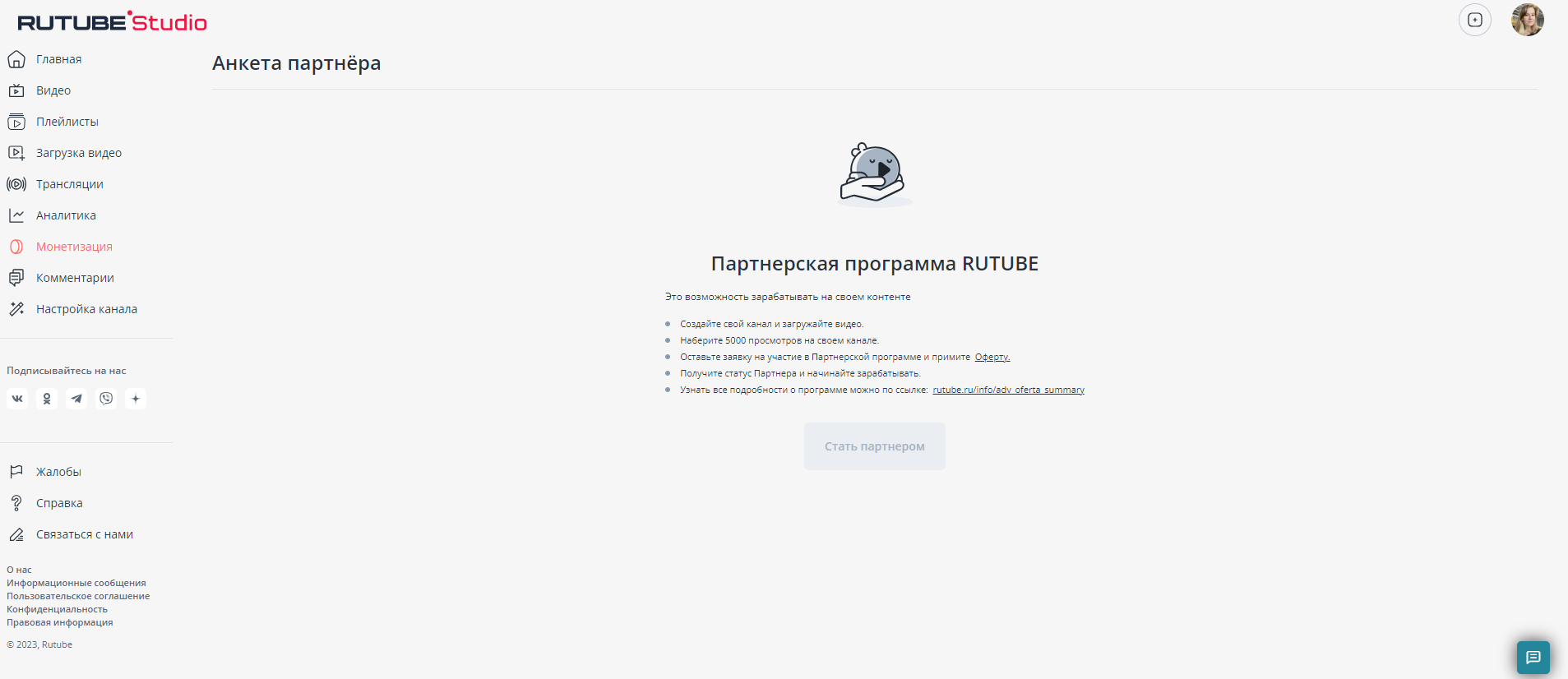 Зайти в RUTUBE Studio и найти там вкладку «Монетизация», нажать кнопку «Стать партнером». После этого заполнить анкету.