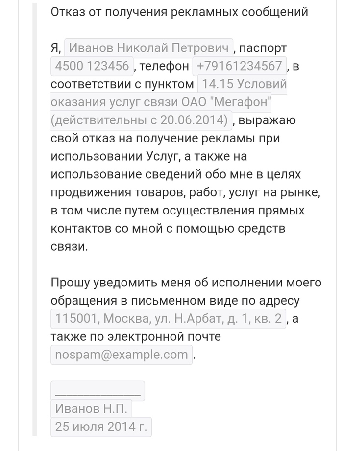 "Ну ничего" подумал я и радостный несу в МТС такое заявление (с сайта росспам)