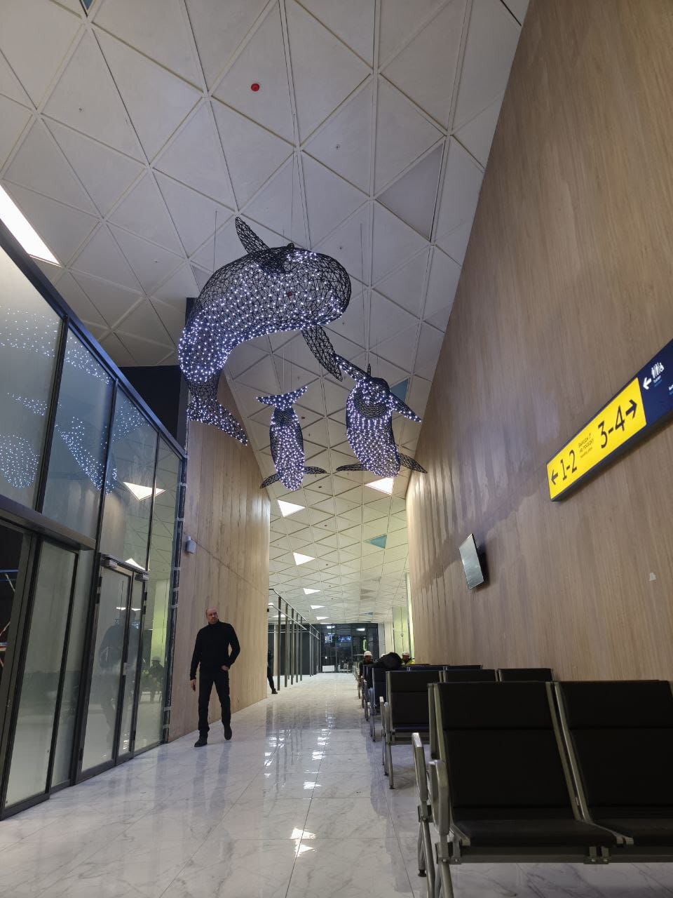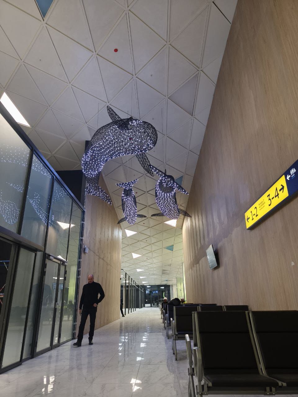 Эта впечатляющая работа длиной 15 метров воплощает грацию и мощь морских гигантов. Чёрный цвет придаёт композиции таинственность и глубину, подчёркивая изящность линий и форм. Светодиодная подсветка выделяет анатомическую красоту этих прекрасных и одновременно беспощадных хищников.