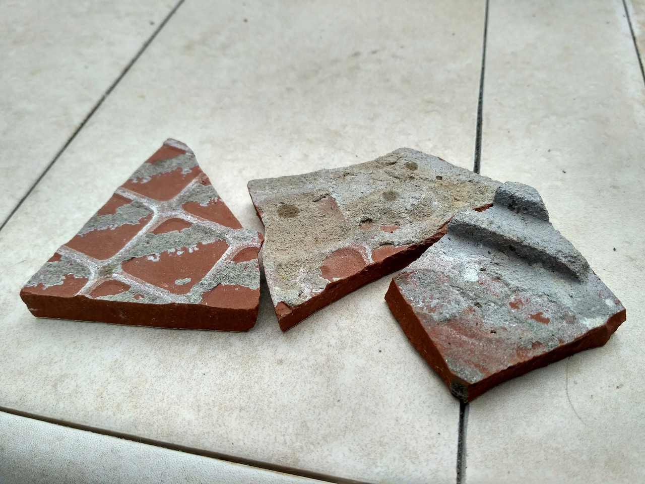 Плитка с узором толще ещё и потому, что была сбита и на ней остались куски клея. Которые я отбивала молотком, но что-то всё равно оставалось.