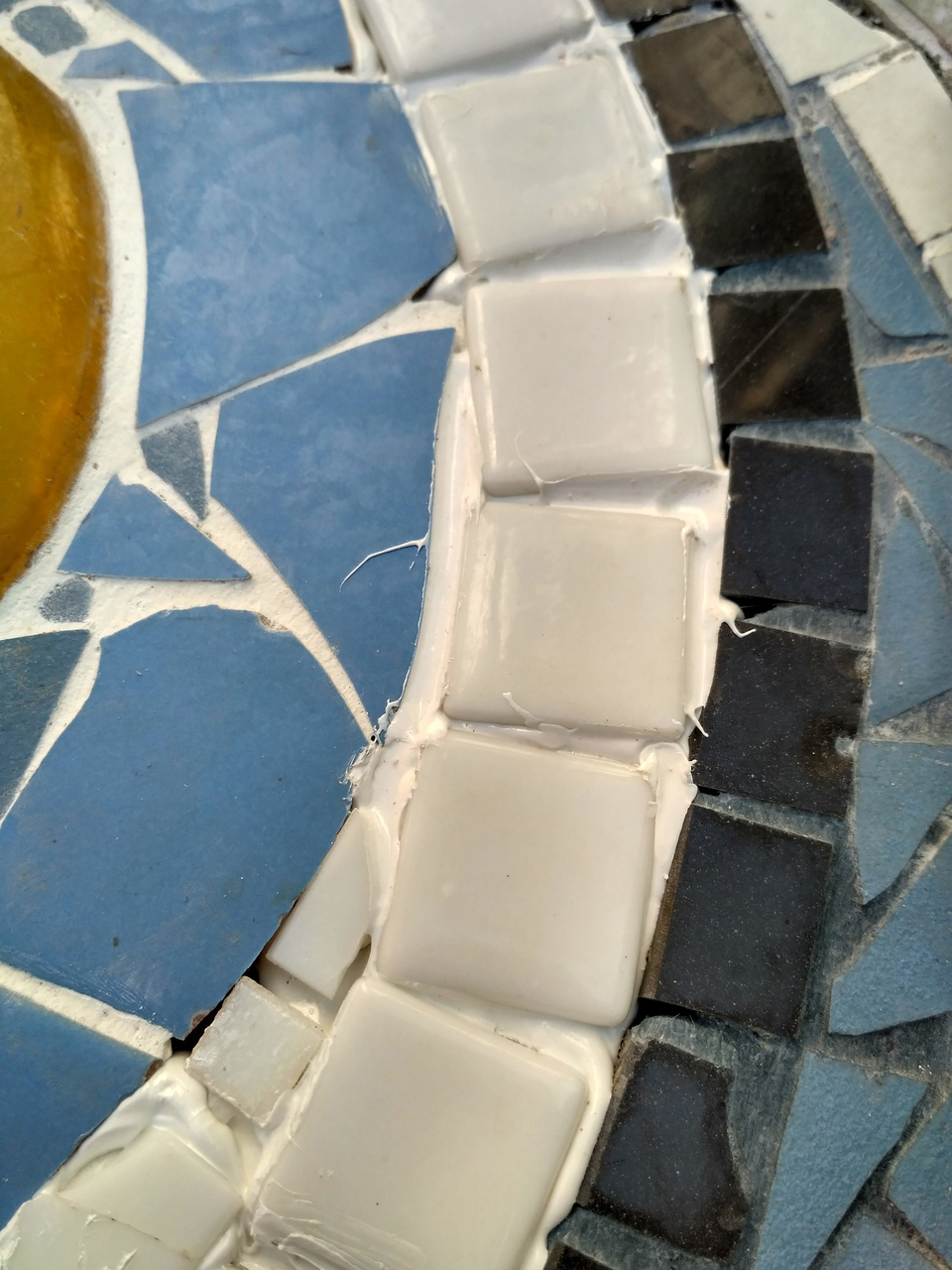 Но не для стеклянной мозаики. Из неё сделан "глаз". Для мозаики лучше брать белый плиточный клей. Но мы ж использовали то, что завалялось :D И поэтому я лепила мозаику на полиуретановый колбасный герметик, предварительно прогрунтовав. Мозаика тонкая и слой герметика под ней будь здоров. В итоге оказалось, белый цвет швов вообще никуда не годится, потому что "глаз" тогда выглядит кислотно белоснежным на фоне спокойного окружения. И было решено прорезать швы и заполнить их серым герметиком. Мы не ищем лёгких путей.