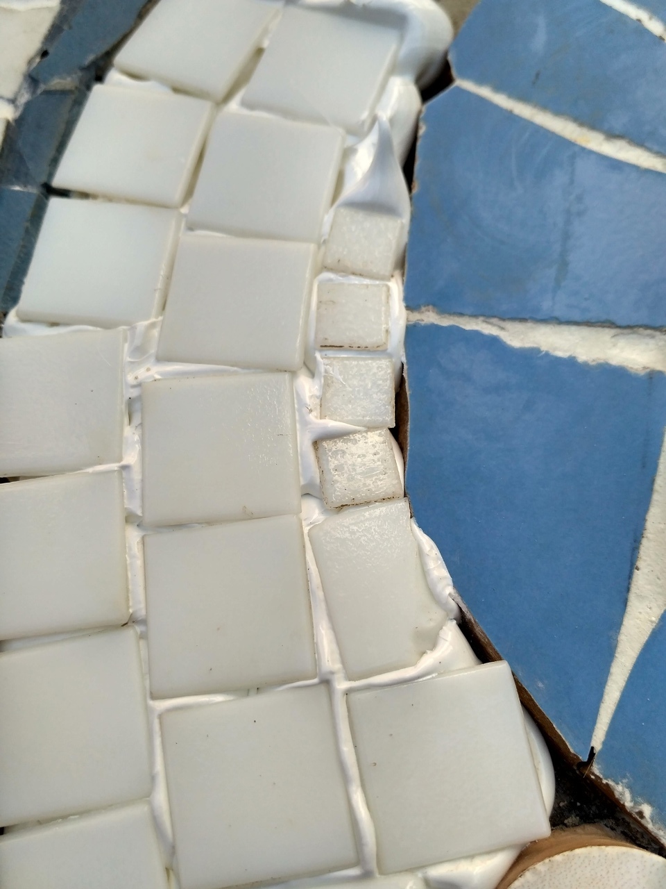 Стяжку сделали прочную, поэтому грунтовать не пришлось. Начала лепить. Керамогранит, конечно, оказался разной толщины. И Саша настаивал чтобы я выравнивала плоскость по высоте количеством раствора под более тонкими кусочками. Он бы так и сделал. Но я забила :) Это не внутреннее помещение, где оно того стоило бы. А на улице и так сойдёт. Разность толщин практически незаметна. В процессе я в основном подбирала кусочек к кусочку. На бежевой части в широком месте видно, как стало лень подбирать и я просто разбивала большой кусок и приклеивала родные осколки друг к другу. Кое-где, конечно, нужны были куски определённого размера и формы и приходилось аккуратно поработать молотком над осколком до получения желаемого результата. Каждый кусочек намазывала клеем и лепила. Клей использовала класса C1 (усиленный, с адгезией не менее 1 МПа), у нас такой как раз завалялся.