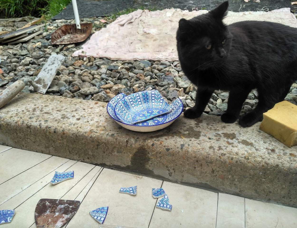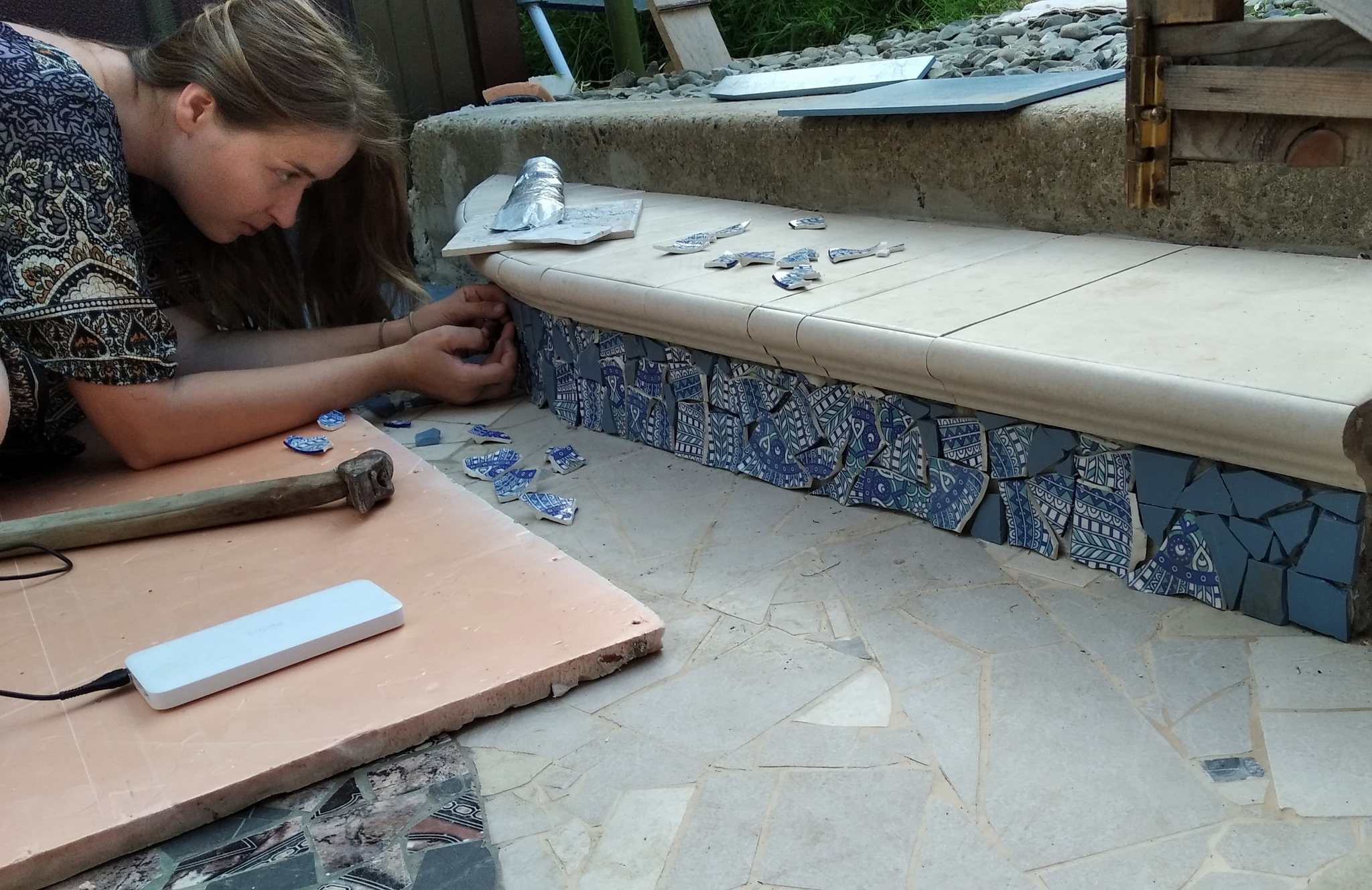Решено было залить цементно-песчаную смесь и выложить это дело битой плиткой. Саша полдня доставал щебень и просеивал его от земли. Потом ещё полдня заливал цемент с арматурой. Сперва на бетоне карандашом был приблизительно накорябан контур того, что хотелось бы увидеть по итогу. Мы притащили плитку и стали набрасывать её пятнами, чтобы решить, какую и куда применить. Фото, собственно делались с той же целью - на фото картинка иногда вырисовывается лучше. А теперь они пригодились для иллюстрации процесса. Все более-менее целые куски плитки просто бились молотком.