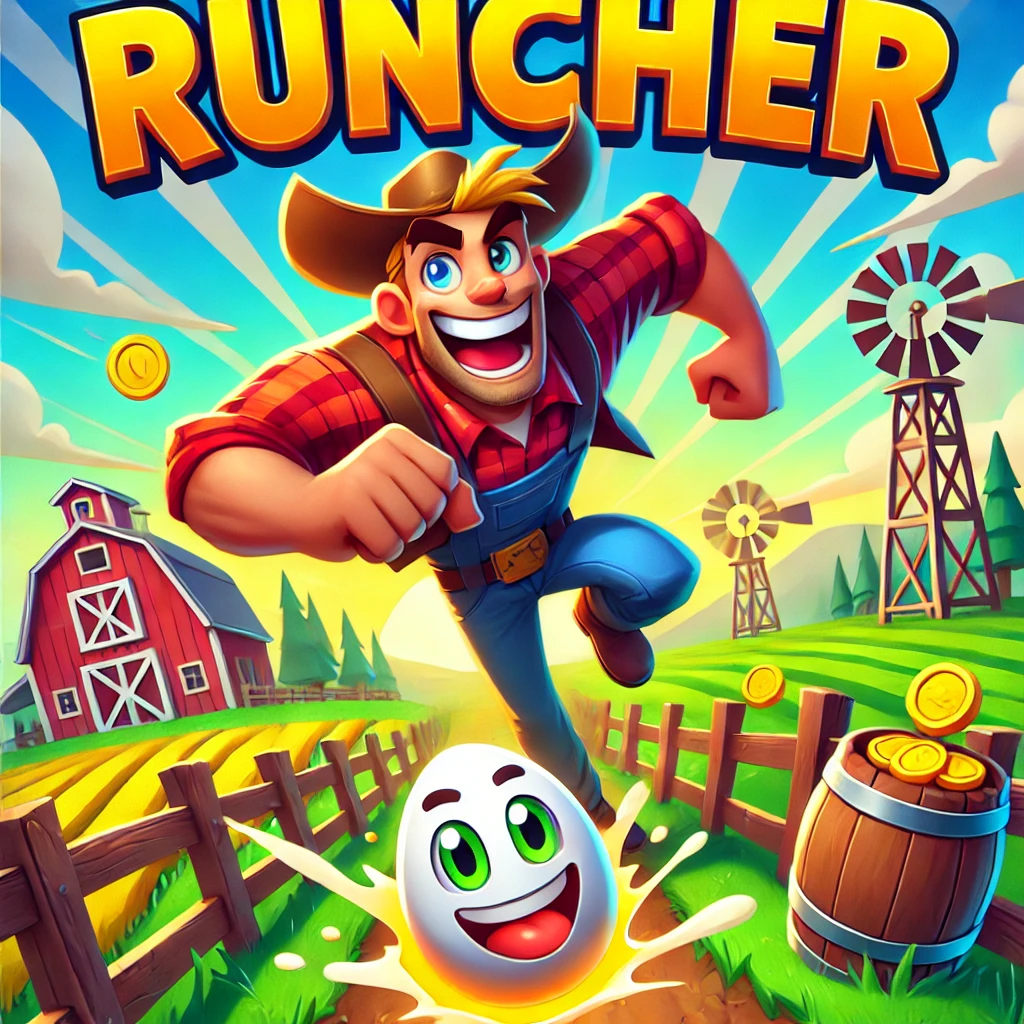 За время разработки проект несколько раз менял название: Runner → CyberBitRunner → BitRunner → NinjaRunner → Runcher. Последняя итерация стала классическим 3D-раннером: фермер бежит за вором, укравшим курицу, несущую золотые яйца.