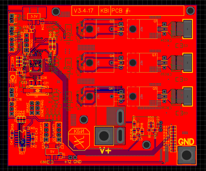 Не проблема, подумал я, и решил развести плату, за одно добавив туда датчики тока на эффекте Холла, один 150 (должен был быть на 50) Ампер по питанию и 30 Амперные на фазовые выводы, чтобы потом попробовать векторное управление.