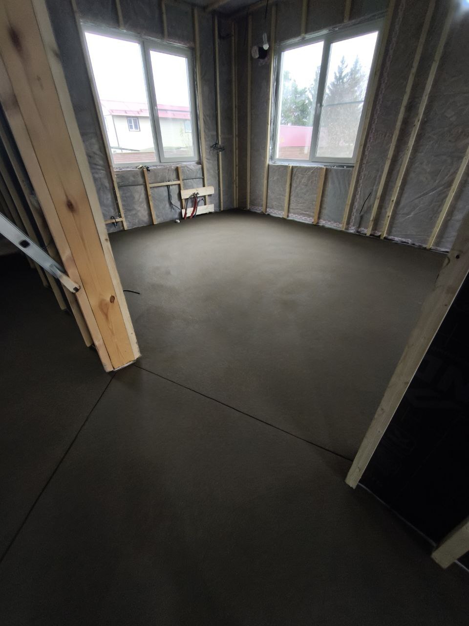 Залили бетонную стяжку с дилатационными швами. Они нужны для компенсации напряжений в стяжке, чтобы уберечь её от растрескивания.