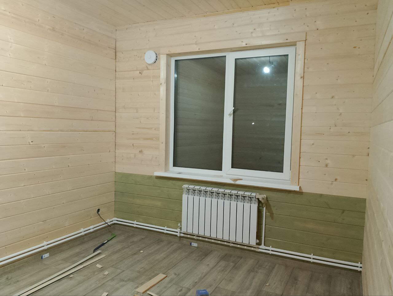 Дальше - внутренняя отделка имитацией бруса, и работа подрядчиков - электрика разведена скрыто, водоснабжение и отопление - открыто, чтобы не было внезапных сюрпризов. Имитацию, на которую монтировались отопительные приборы и другие сложносъёмные элементы, хозяева дома предусмотрительно покрасили заранее.