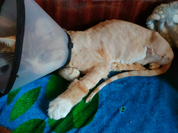 Сейчас кот у нас. Даем прописанные лекарства, обрабатываем шов, кстати, шов очень красивый и аккуратный. Ужасно меня задалбывают его блохи, но увы - еще неделю с небольшим его нельзя ни мыть, ни обрабатывать от паразитов, поэтому блох просто ловлю. Рыжий привыкает к остальным нашим питомцам - три кошки-подобрашки и небольшой песик из приюта - они к нему. В принципе хорошо привыкают, я опасалась, что кошки не примут или что пес будет неаккуратен, но нет, тьфу-тьфу. Аппетит у котенка просто зверский и голосок при таком крохотном тельце - ужасно пронзительный))) Есть он хочет всегда, когда не спит. Спит много - действие одного из обезболов, это нормально, врач сказал. В воротнике котенку конечно неудобно, но что делать, осталось 9 дней потерпеть, снимем швы - снимем воротник. Потом обработка от паразитов, потом, через пару месяцев кастрация, вакцинация...