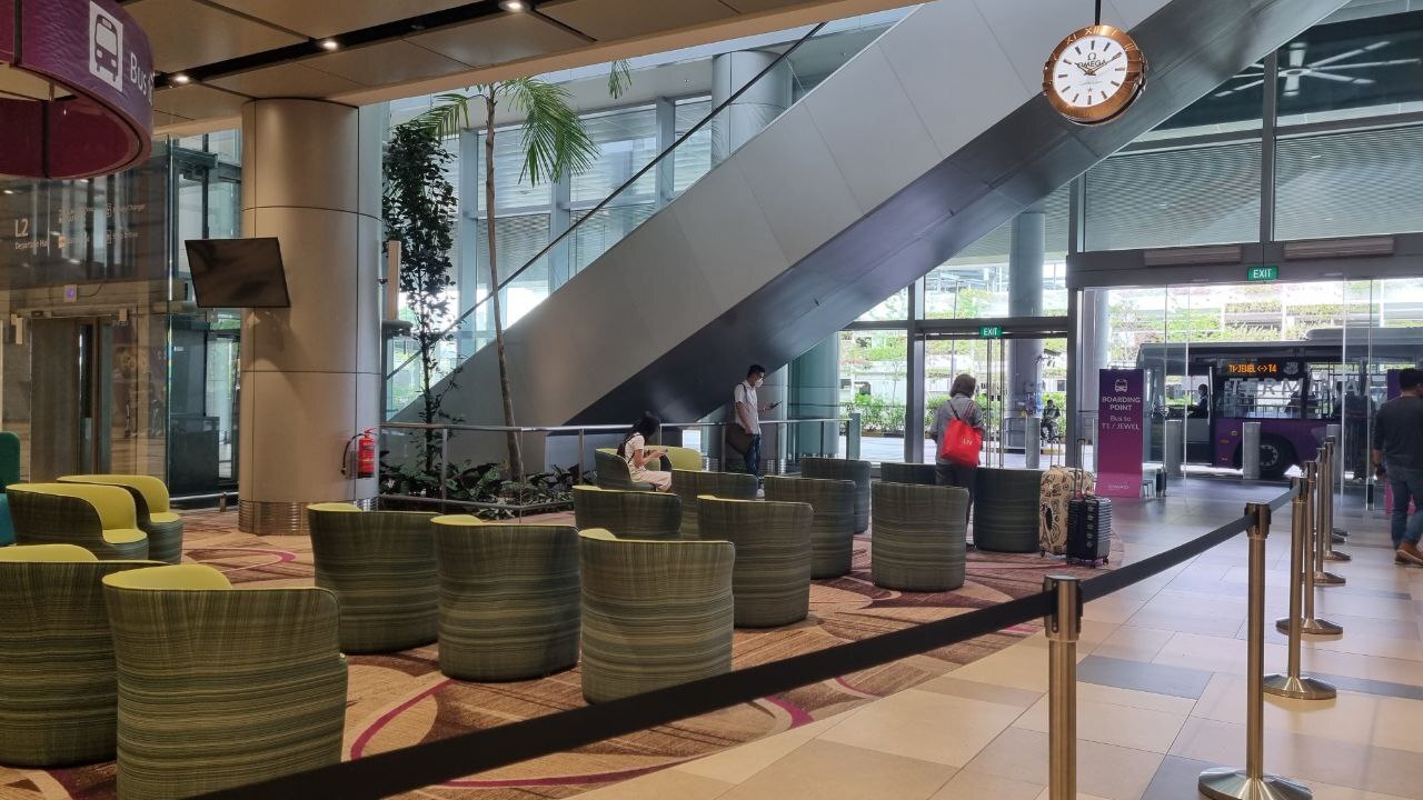 Хоть Сингапур и отказался уже от ношения масок в обязательном порядке повсеместно, но в метро они всё ещё нужны. От аэропорта идёт небольшая наземная ветка метро, аппендикс с двумя станциями. На станции Tarah Merah пересадка на зелёную ветку (East West Line). Поезд приходит на центральный путь - отдельный путь для поезда из аэропорта.