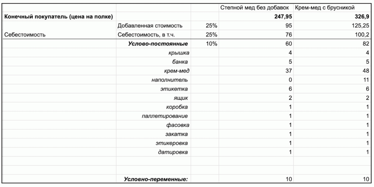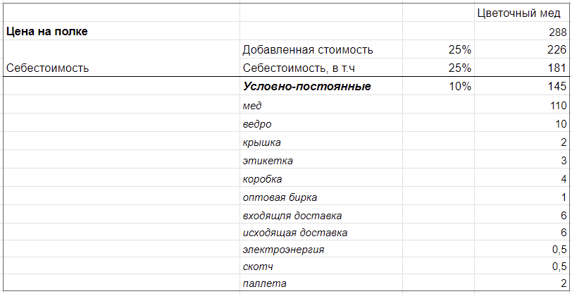 Наняли консультанта, который рассчитал нам себестоимость меда. Она была такой: