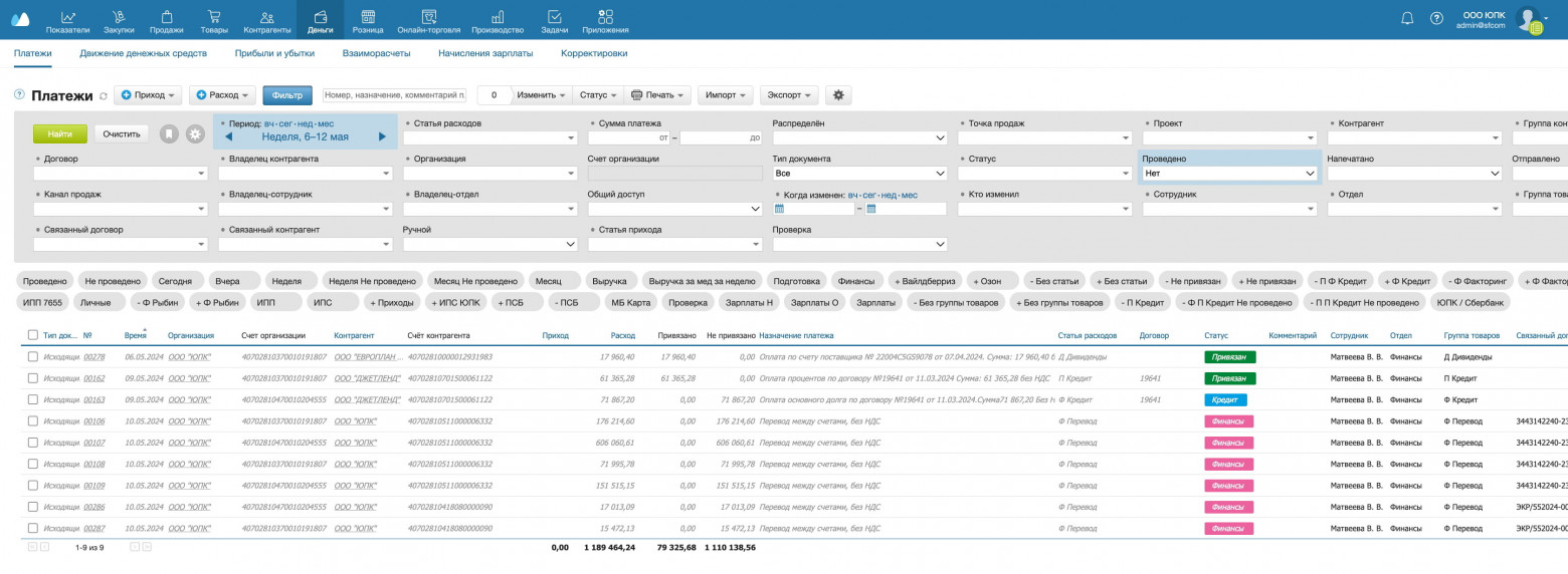 В МоемСкладе ведем платежный календарь. Это таблица, куда пишем будущие поступления и расходы. В расходы записываем оплату по кредитам, задолженности поставщикам, оплату за сырье и т.п.