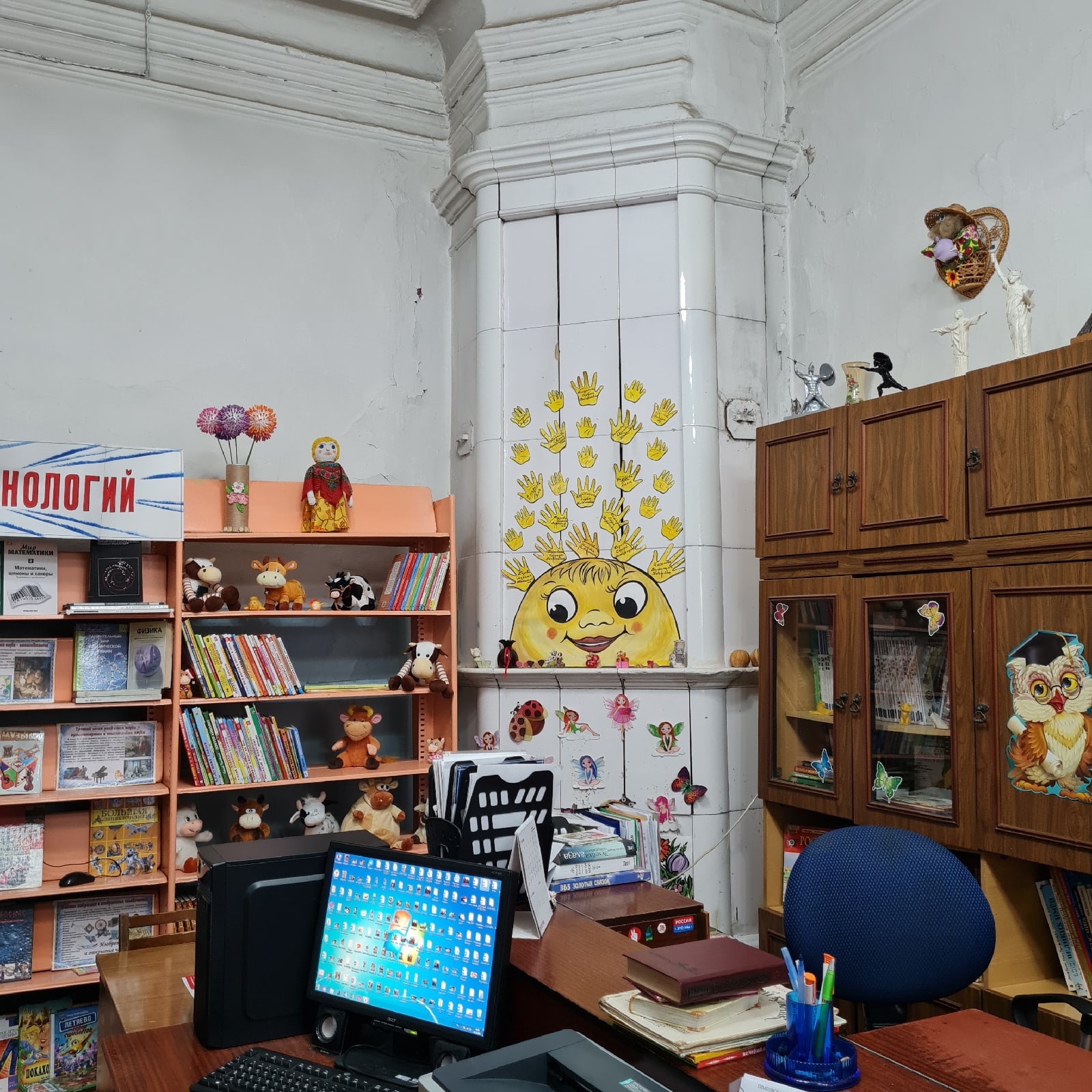 Зато есть интернет и нормальный компьютерный парк. Это старинная печь рабочая, но ее не используют. Библиотекой заведует жизнерадостный Сергей, который отдал нам собранные батарейки. и накормил шарлоткой. Говорит, что жители не верили, что батарейки и правда утилизируют цивилизованно. Батарейки в винных бутылках и майонезных ведерках