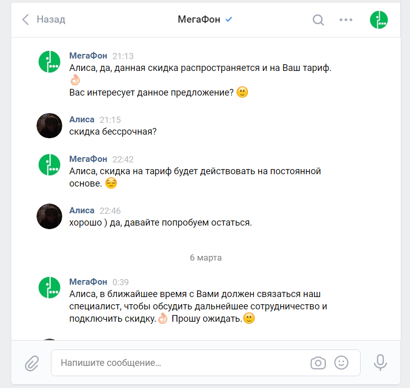 Акт второй. Перевожу номер мужа. А у него довольно дорогой тариф, на который кончается скидка за лояльность (с 2000 года на МФ) и он становится совсем золотой (и при этом в прошлом году у него умудрялись уводить то 20 рублей, то 60). Все по новой - не совпадают данные. Пишу в ВК - мол, что именно не совпадает, если 2 недели назад все совпадало. Ладно, отвечают, все совпадает. Процесс пошел. В ВК начинают предлагать скидосы. В какой-то момент хорошие скидосы. Муж мигрировать уже и не хочет, смски на него валятся. Ладно, давайте скидку и обещайте не воровать мелочь - остаемся.