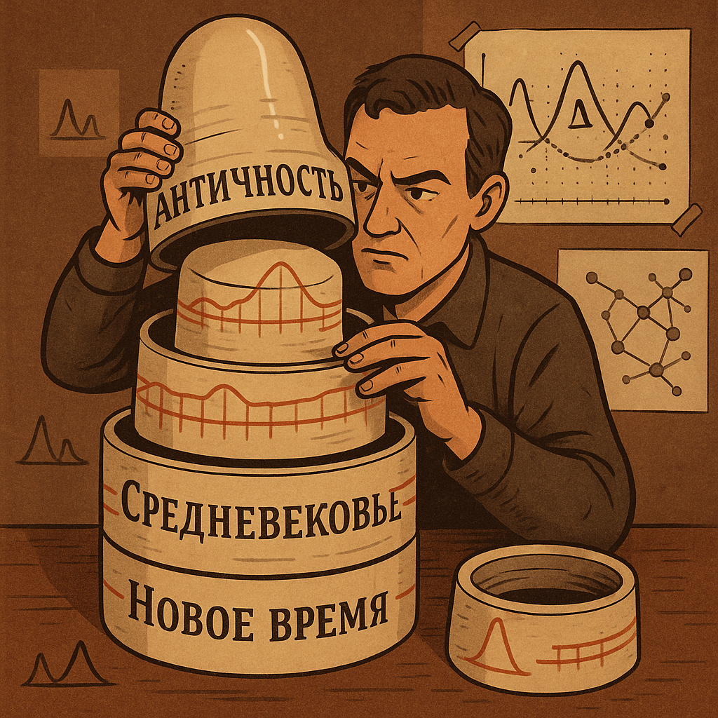 Честно говоря, всё началось просто. Долго копаешься в датах, в летописях, и в какой-то момент приходит осознание — странное, неприятное. Перед тобой уже не история, а какая-то матрёшка. Откроешь «античность» и узнаёшь в ней сюжеты из Средневековья. Возьмёшь раннее Средневековье — а оно совершенно подозрительно ложится на раннее Новое время. И снова, и снова: война, потом собор, потом реформа. Кризис, налоговый пресс, кодификация. Старый центр теряет власть, фронтир расширяется, рождается новый центр. Времена меняются, имена другие, декорации свежие — но сценарий один и тот же.