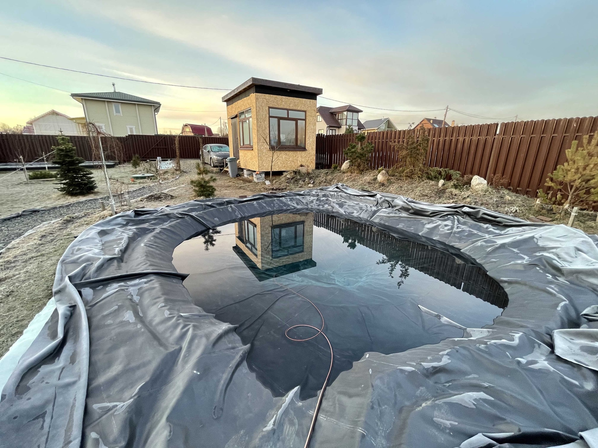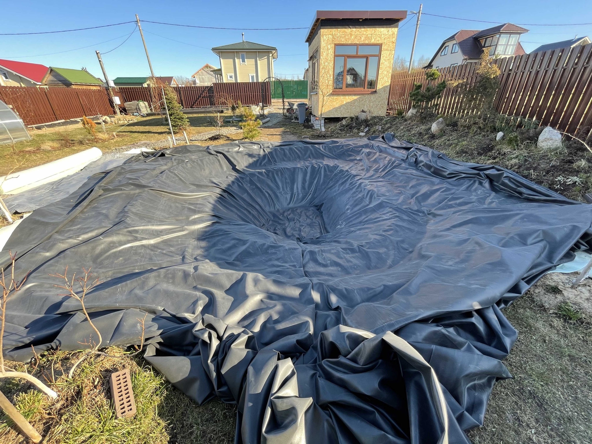 Итак, пруд был выкопан, решил под мембрану постелить геотекстиль плотностью 500 г/м2, саму мембрану выбрал EPDM Firestone 1.02мм.