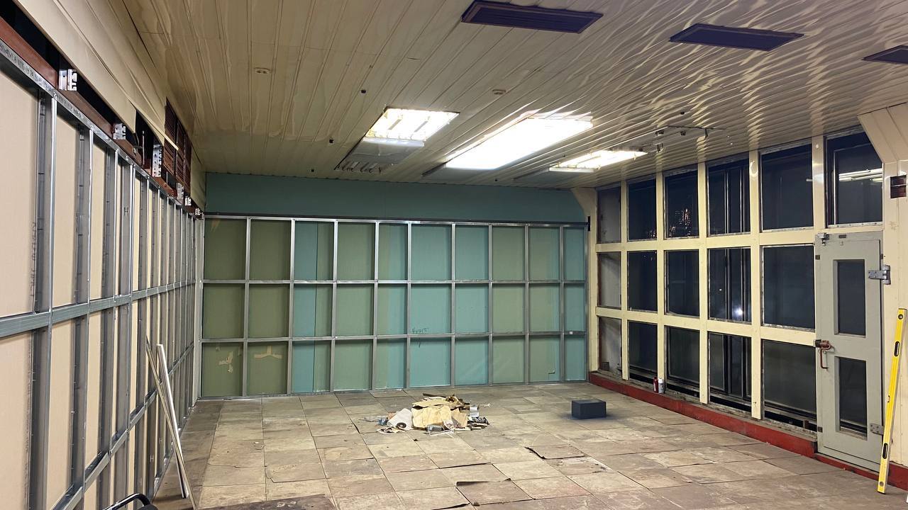 Здесь направляющие каркаса уже закреплены сверху и снизу, но для этого нам пришлось 4 дня помучаться с перевешиванием подвесного потолка. Т.к. потолок закреплен на алюминиевой направляющей, а она в свою очередь закреплена на приваренные стальные пятаки на нижней плоскости нужного нам уголка... фух. сам чуть не запутался. В общем нам пришлось поочередно все их срезать и перевесить на металлические уголки с монтажной лентой вставленные внутрь. Короче, проще показать на фото ниже.