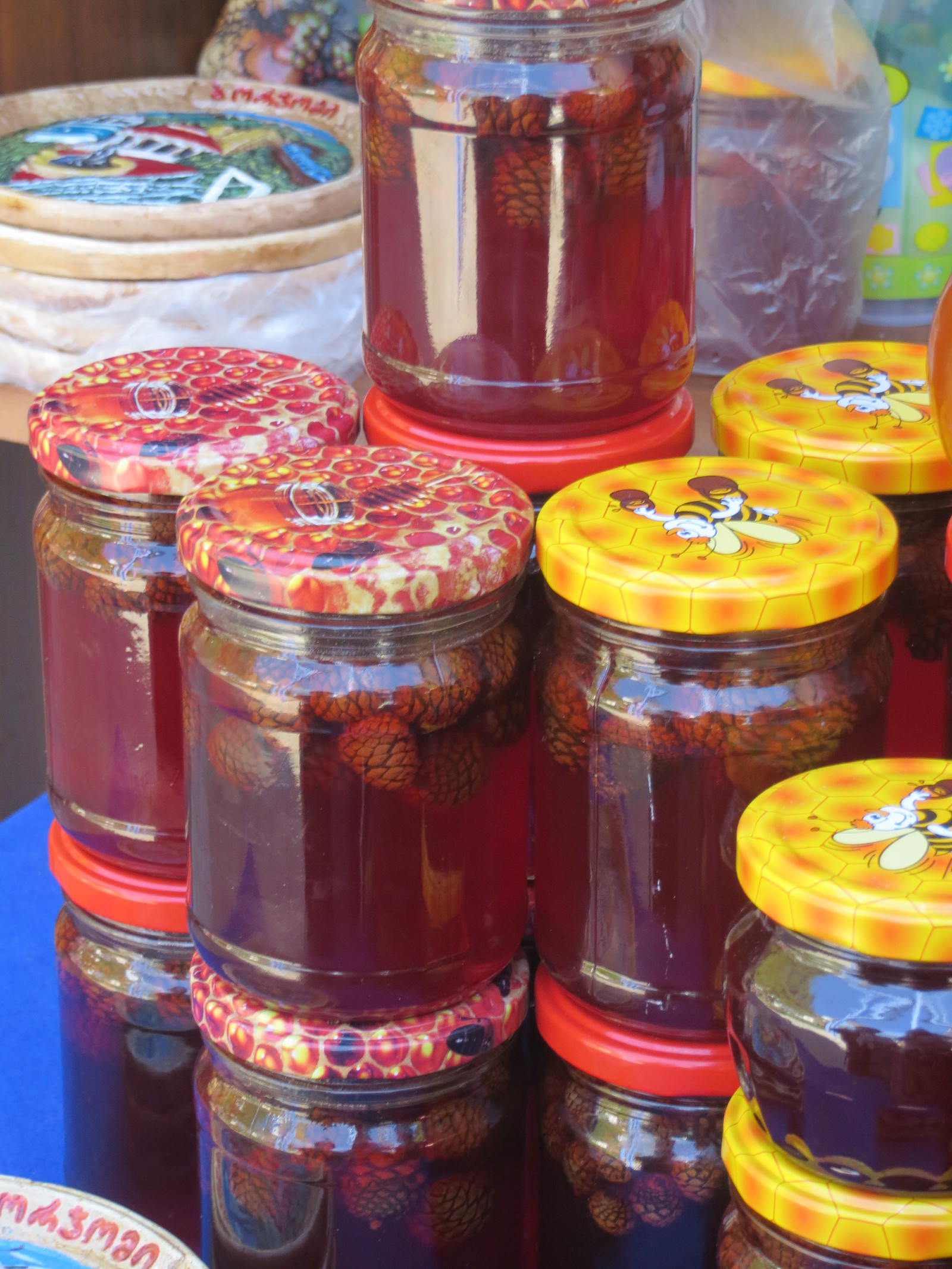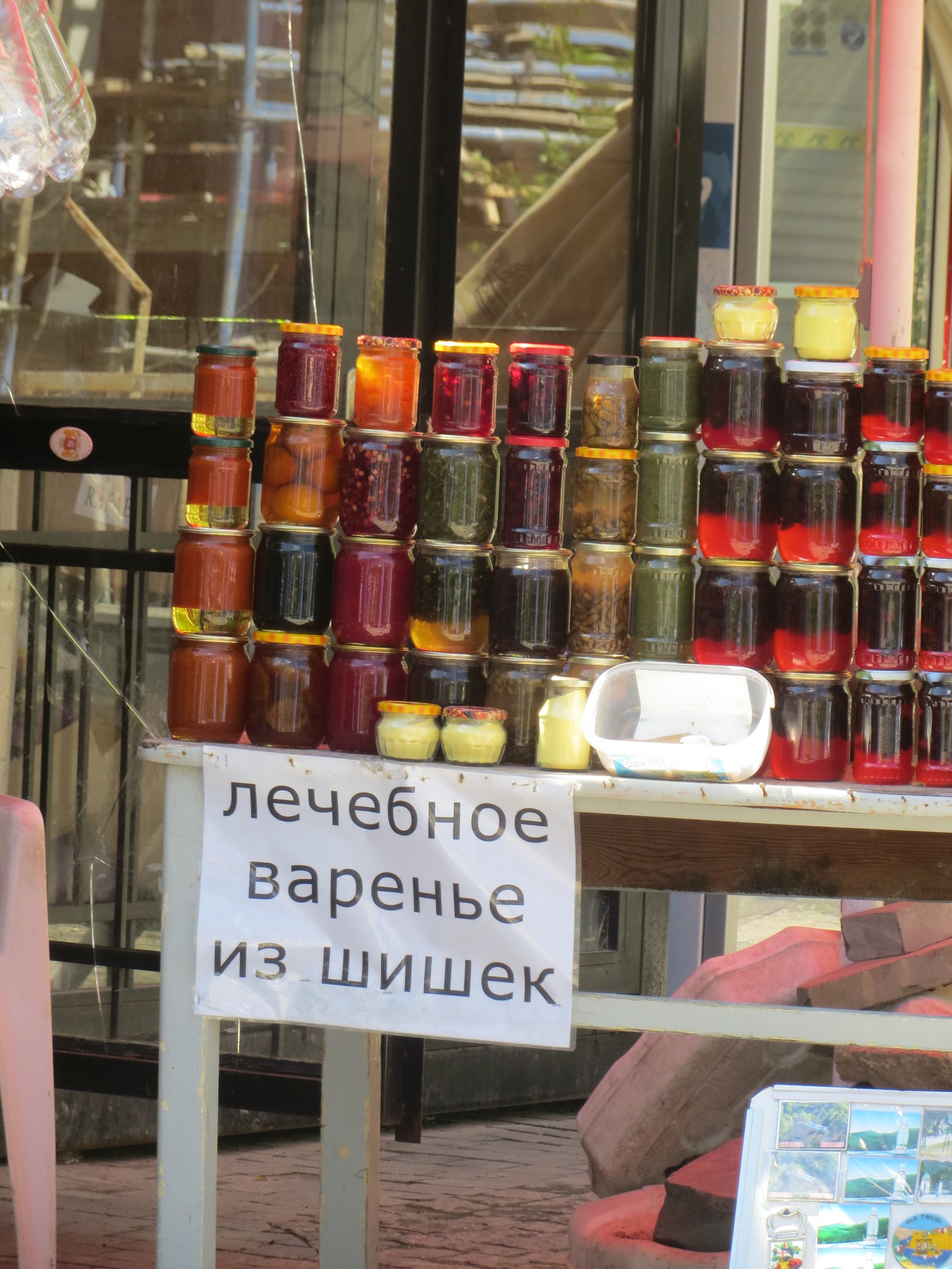Рядом стоят торговцы с знаменитым шишечным вареньем, сосновой пыльцой и мёдом.