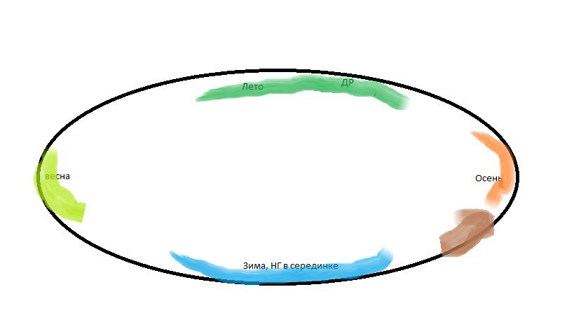 У меня год выглядит как эллипс. Внизу, под зимой стою я и оттуда наблюдаю за течением времени. Оно идет по часовой стрелке. На 6 часов - Новый год, вся зима внизу. Слева весна, прямо передо мной лето, справа - осень. При этом я никуда не перемещаюсь, а стою внизу всегда.