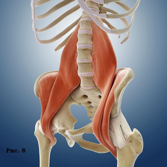 Но почему же когда мы поднимаем туловище, мы чувствуем пресс сверху, а когда поднимаем ноги, то снизу? Да потому что, скорее всего, если бы вы «поднимали ноги» правильно, то тоже чувствовали бы пресс сверху. Дело в том, что при таких упражнениях, как подъём корпуса, в том числе на наклонной скамье, подъём ног лёжа, подъём ног в висе с упором и прочее, пресс участвует лишь в небольшой амплитуде движения, когда происходит скручивание – притягивание грудины к тазу. Вспоминаем куда крепится прямая мышца живота – к лобковой кости! Как пресс может быть связан с ногами? Да никак. Подъём ног сам по себе, как и подъём корпуса, осуществляется подвздошно-поясничными мышцами, которые находятся глубже под нижней частью пресса. Рисунок 8.