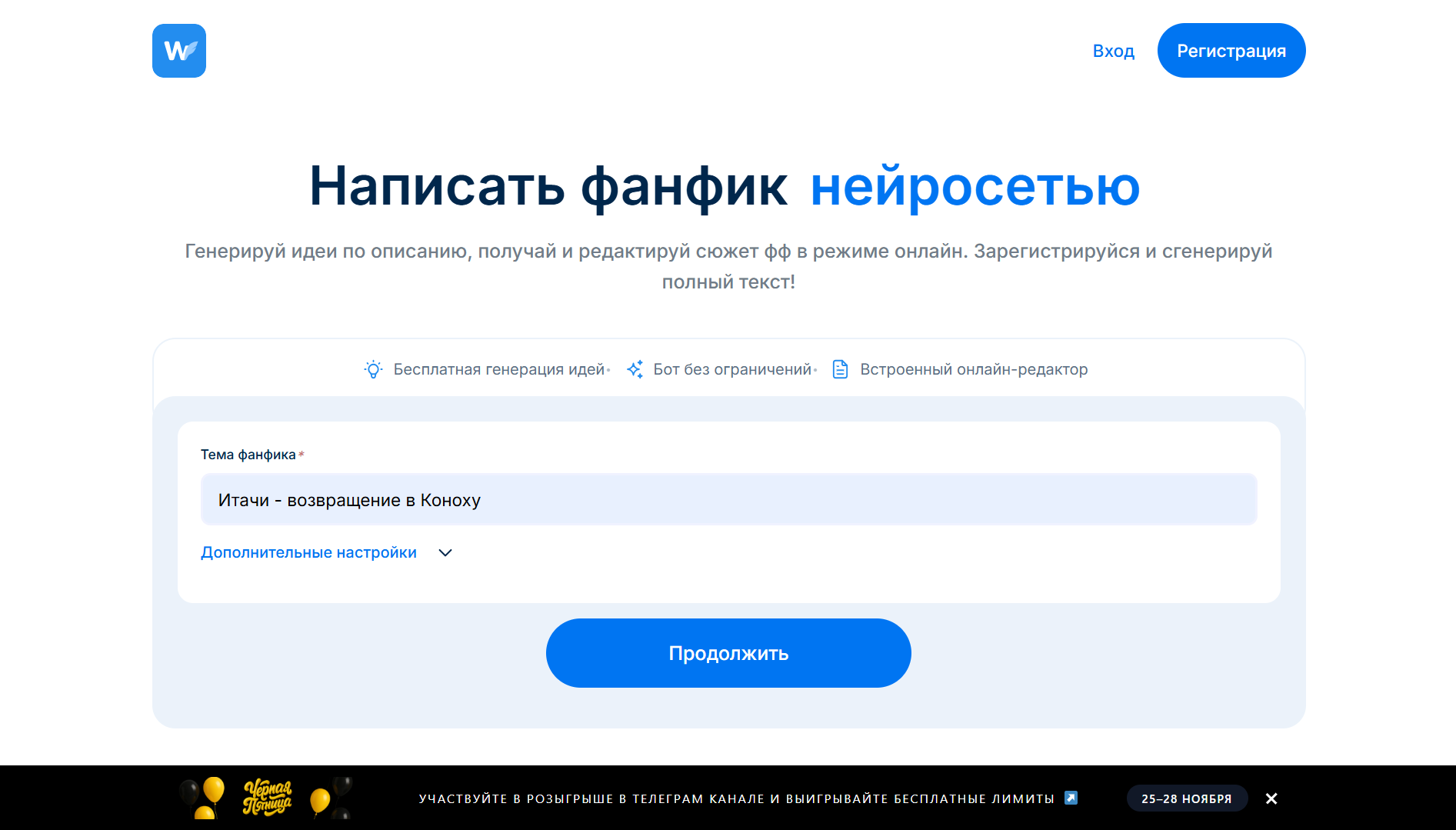 Всё начинается с идеи. Просто введите тему, добавьте ключевые слова и, при желании, краткое описание. Например: «Романтический фанфик по Гарри Поттеру, где Драко и Гермиона встречаются спустя годы».