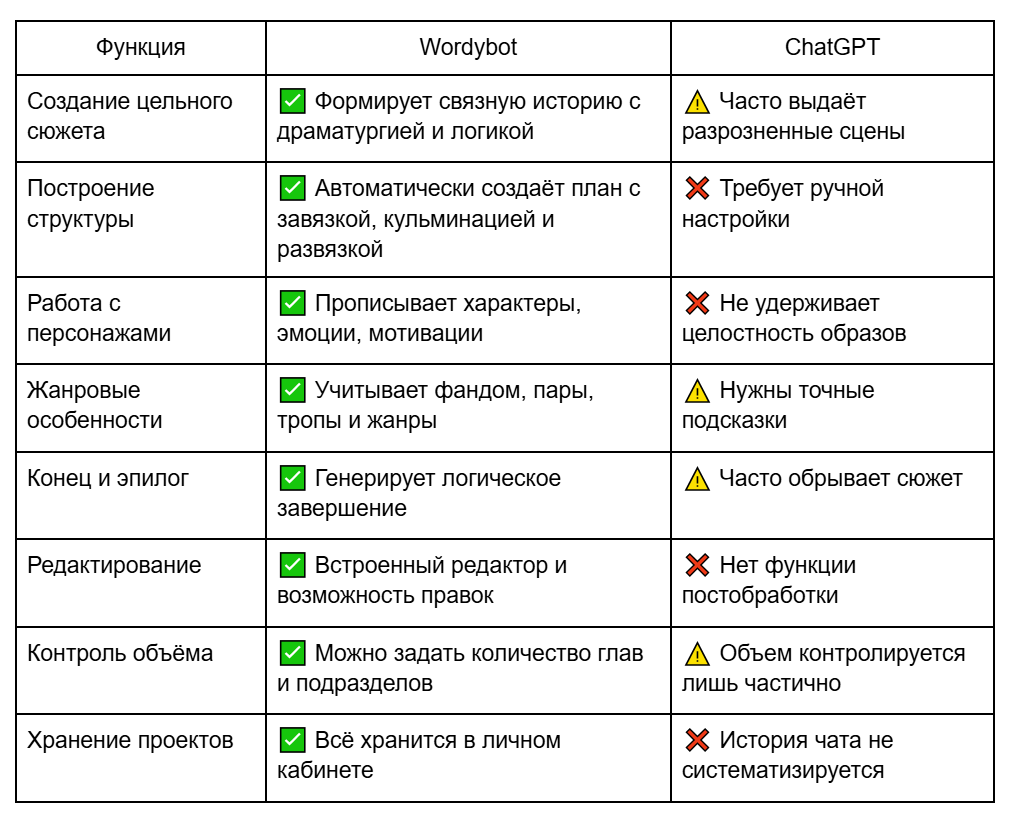 Такой подход помогает сохранить авторский замысел и сделать сюжет живым. Wordybot не пишет за вас — он пишет вместе с вами, вдохновляя и направляя. Вы остаетесь автором, а искусственный интеллект становится вашим соавтором и литературным режиссёром.