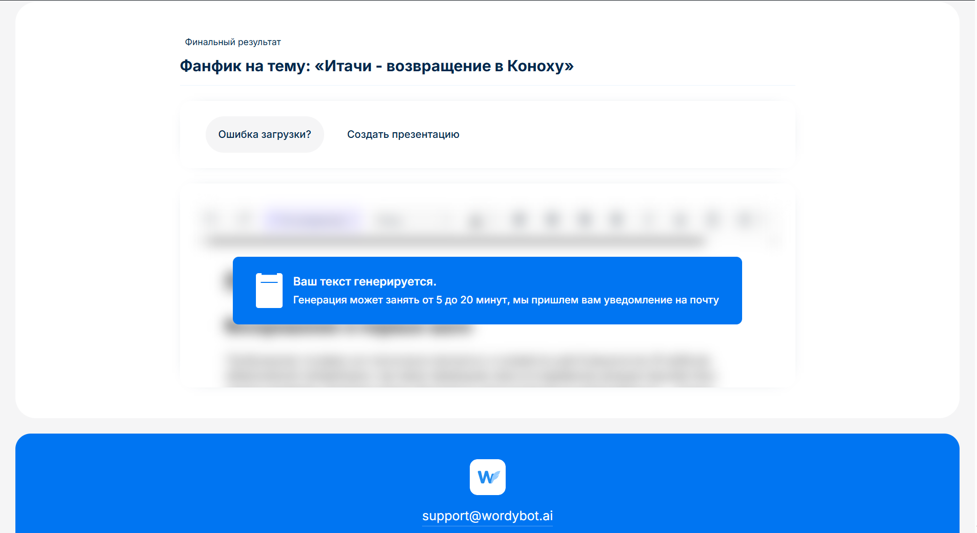 Wordybot — не просто нейросеть-генератор фанфиков. Это полноценный интеллектуальный инструмент, чьё основное предназначение — помогать создавать длинные и связные тексты на русском языке любого формата: от романов и рассказов до научных работ и деловых документов.