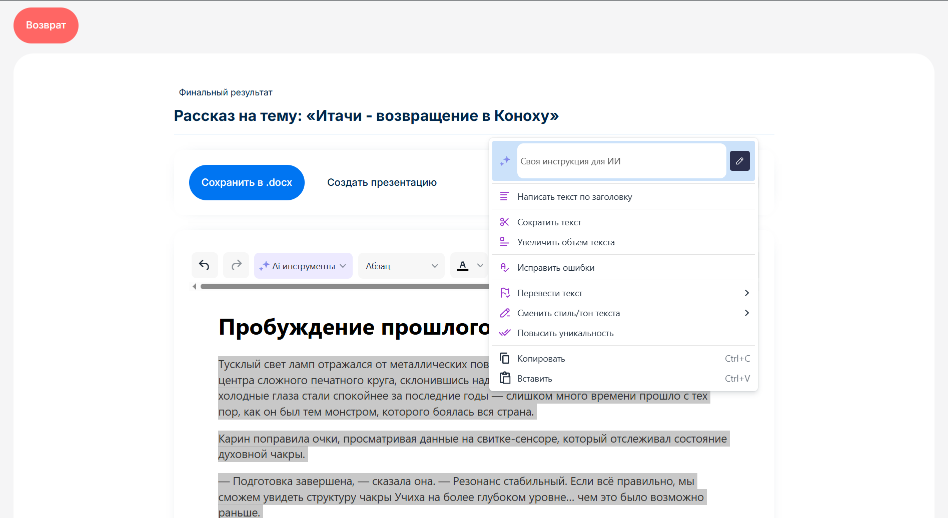 После завершения вы получаете полноценный текст с продуманным сюжетом и эмоциональной динамикой.
