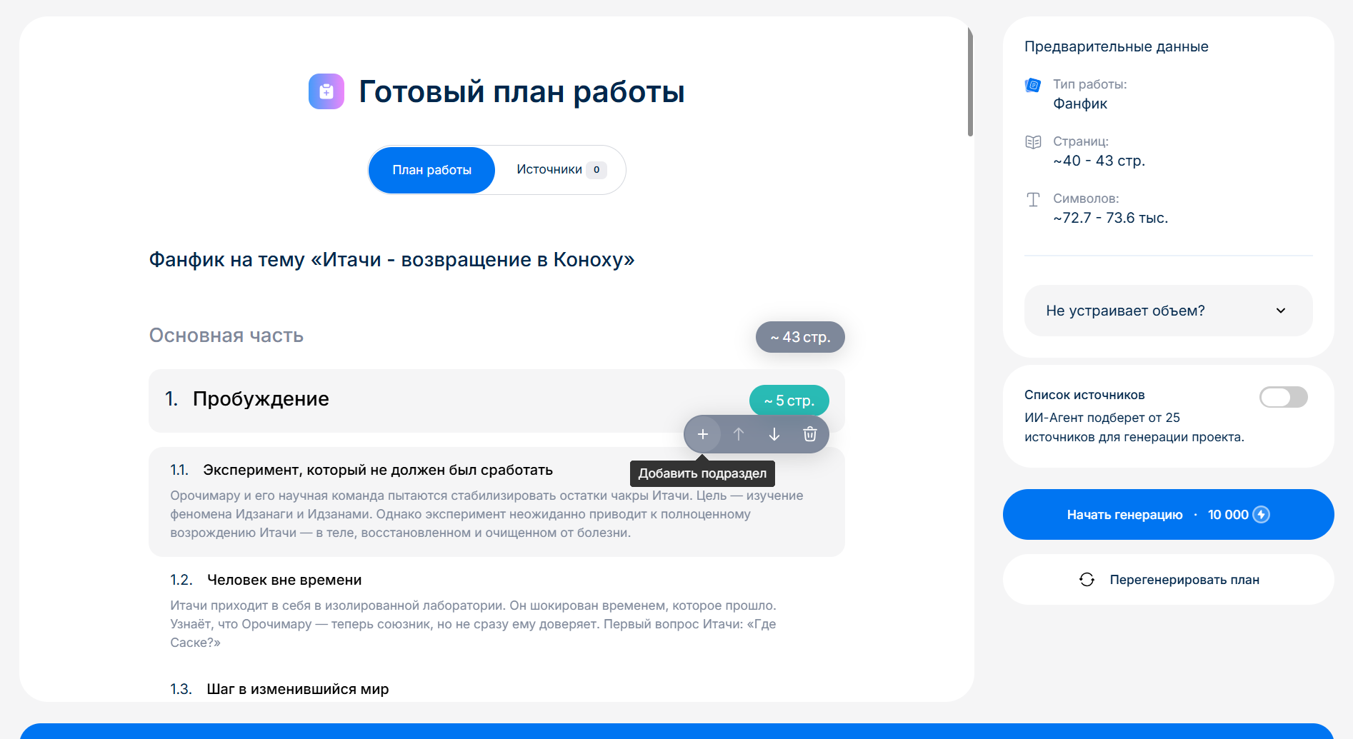 Если предложенный план вам не подходит, его можно полностью перегенерировать или отредактировать вручную: поменять местами главы, переименовать их или добавить новые.