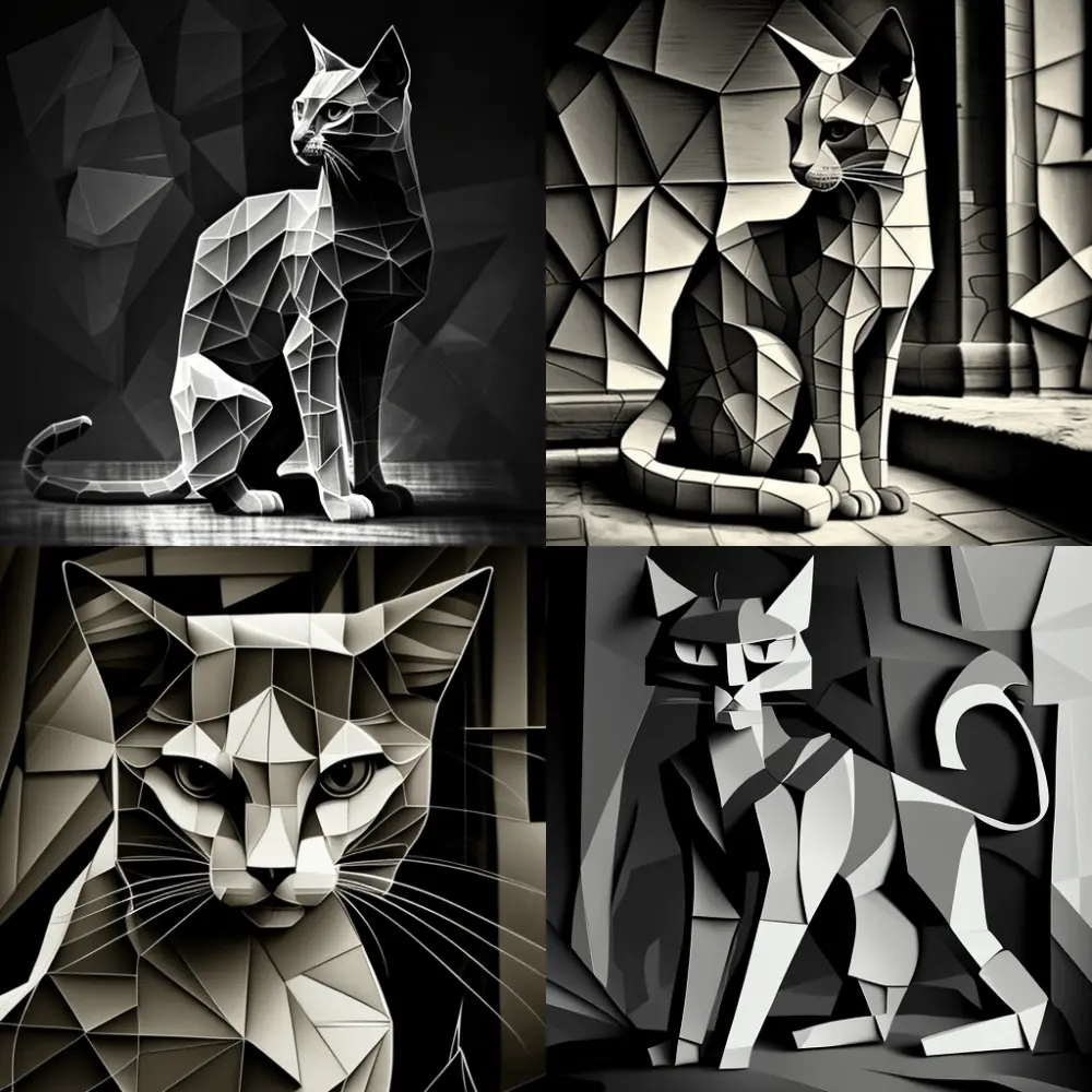 Специфицируем запрос и попросим нейросеть нарисовать не просто кота, а монохромного кота в стиле синтетического кубизма а-ля Пикассо: