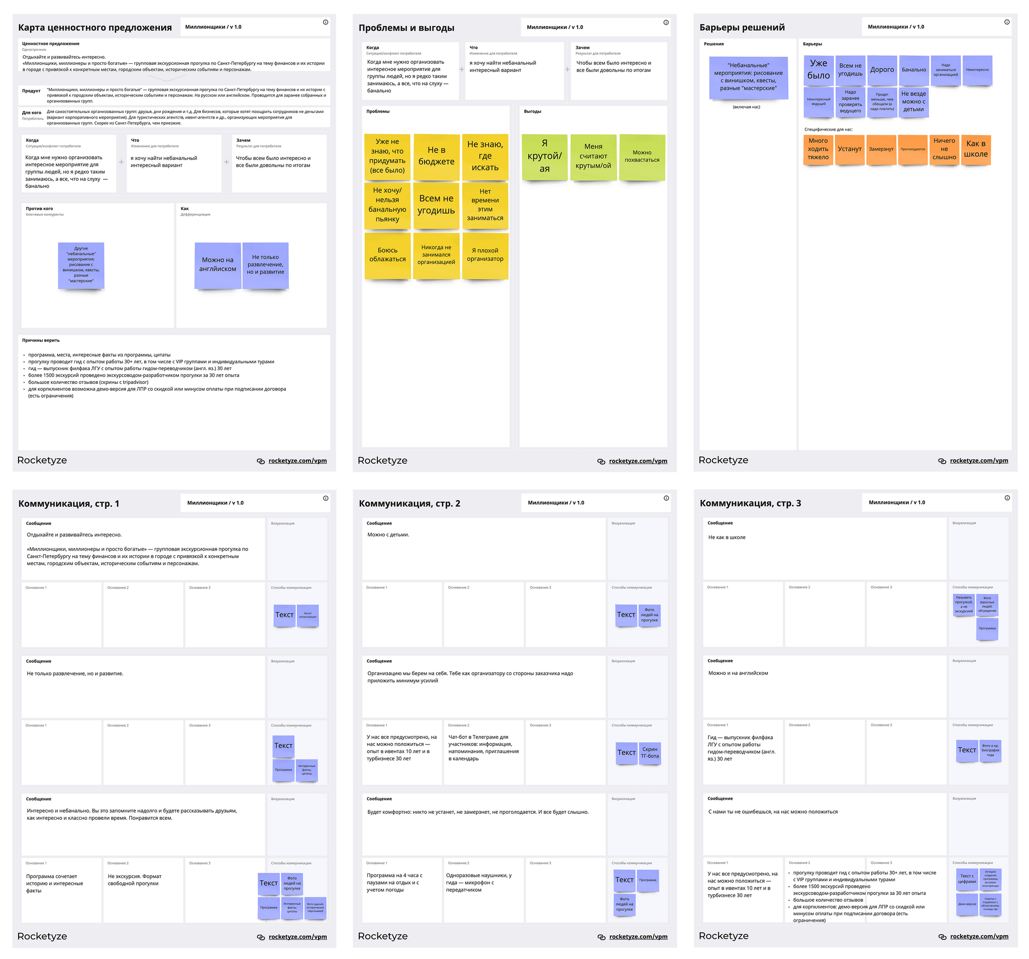 В качестве примера используем Карту ценностного предложения реально существующего продукта — групповой экскурсии по Санкт-Петербургу на тему финансов «Миллионщики, миллионеры и просто богатые». Перед нами стоит задача разработать лендинг, который будет использоваться в рекламе продукта.