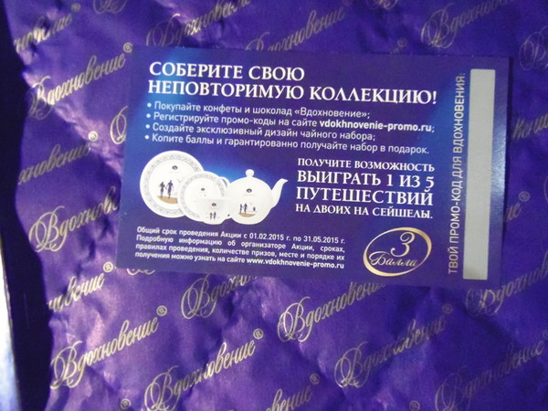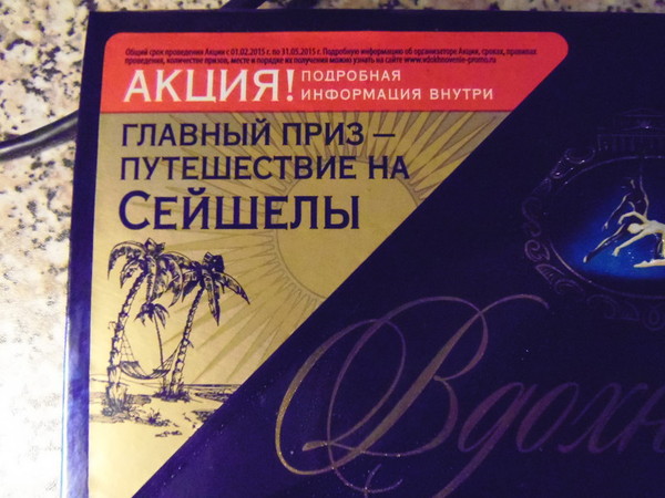 Сейчас модно использовать в качестве дополнительного стимула мотивировать покупателя тем, что, купив товар, он становится участником какого-нибудь розыгрыша и может выиграть весьма ценную вещь или услугу. Об этом сообщают нам яркие упаковки, ярлыки, вкладыши, и подарили нам коробку конфет. Наклейка на коробке обещала главный приз - "Путешествие на Сейшелы".