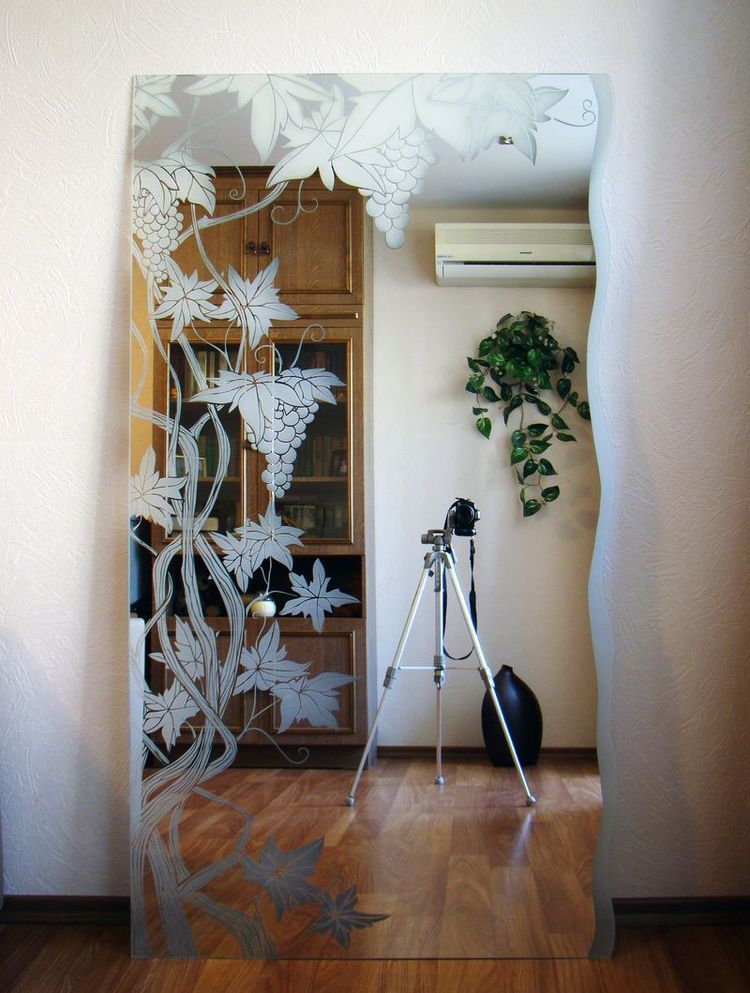 Когда-то мы занимались художественной обработкой зеркал (я же говорил, мы люди увлечённые). Зеркало с виноградом имело размеры 2000x1500 мм. Закончив работу и упаковав изделие, мы с женой начали укладывать его в машину. Когда зеркало было уложено послышался лёгкий и непередаваемый звук неприятности. От правого нижнего угла пошла стрела. Позвонил заказчику, рассказал о трагедии и пообещал вернуть деньги. Зеркало же повёз в мастерскую, где решил сделать ему редизайн и оставить себе. Отрезал волной от края полоску с трещиной и запескоструил. Получился очень интересный вид. Привёз домой, и понял что в интерьере зеркало смотрится ещё лучше. Позвонили заказчику, поведали о преобразовании изделия. Решили, что он посмотрит и если ему понравится то заказ будет выполнен. Собственно это и случилось. Остался я без зеркала, а заказчик с.