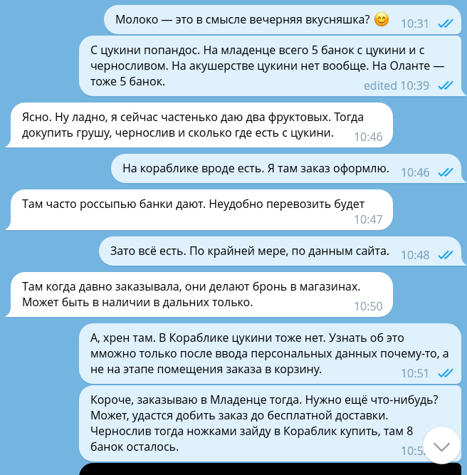 Т. к. жена сидела в декрете, то я ей лично перечислял по 20 тысяч рублей ежемесячно, плюс полностью снабжал ребёнка -- продукты, одежда, медицина и т. п. В течение оставшегося времени декрета, который жена отбыла от и до (т. е. все три года) я приходил практически ежедневно, помогал по дому, кормил, участвовал в гулянии, купании, укладывании и т. п. Домой приходил к полуночи, где нужно было ещё что-то пожрать самому, что-то поделать по дому и собраться на работу на завтра.