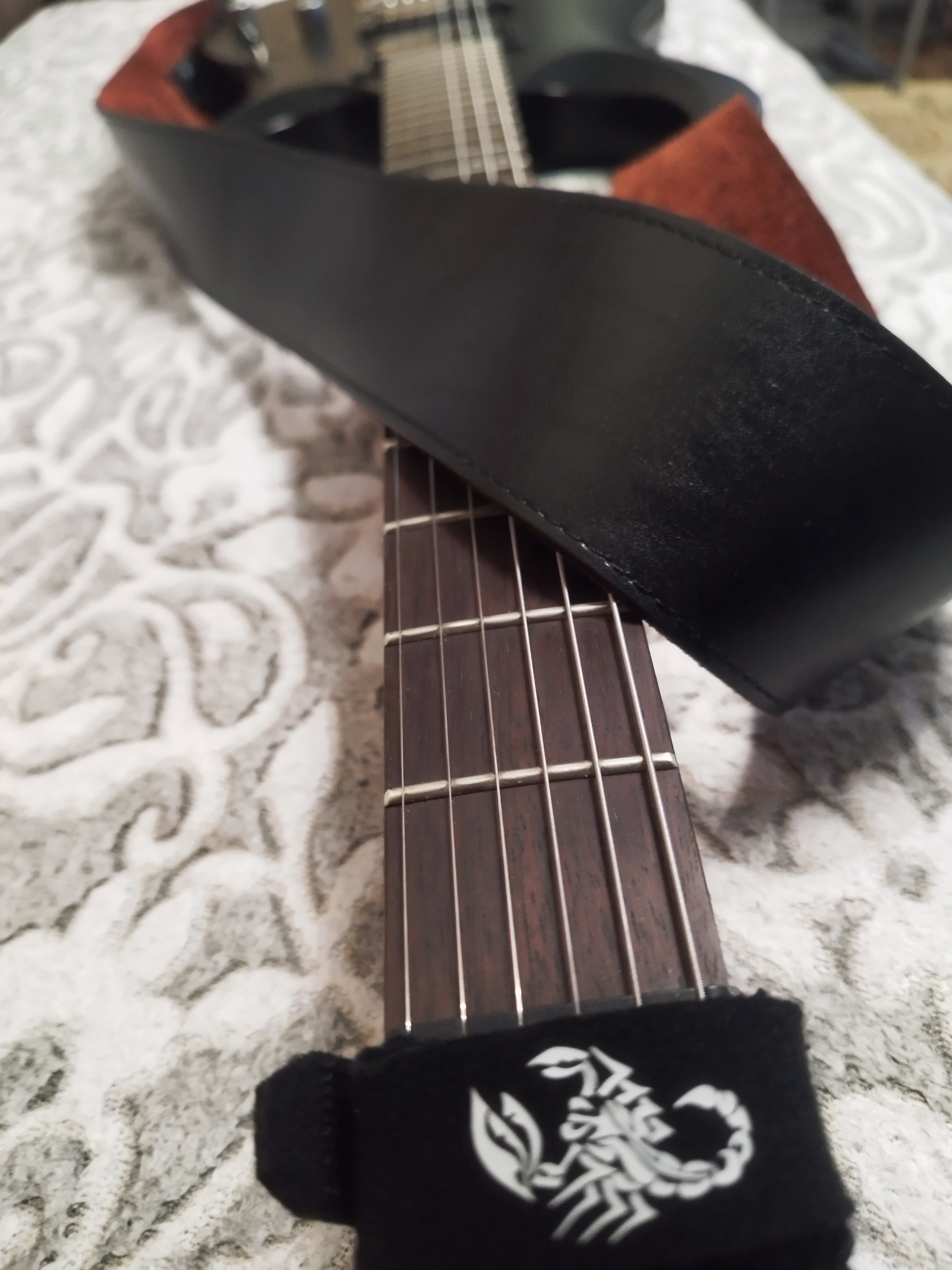 Спустя год произвел апгрейд самой важной детали гитары - ремня. Купил кожанный тяжелый ремень. Это позволило плотно зафиксировать легкую гитару при игре стоя.