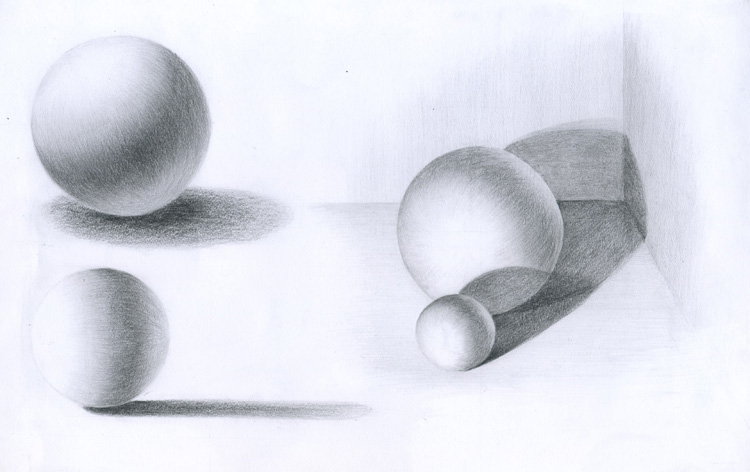 вот правильное расположение теней на шаре. на цилиндре и конусе тень строится по такому же принципу
