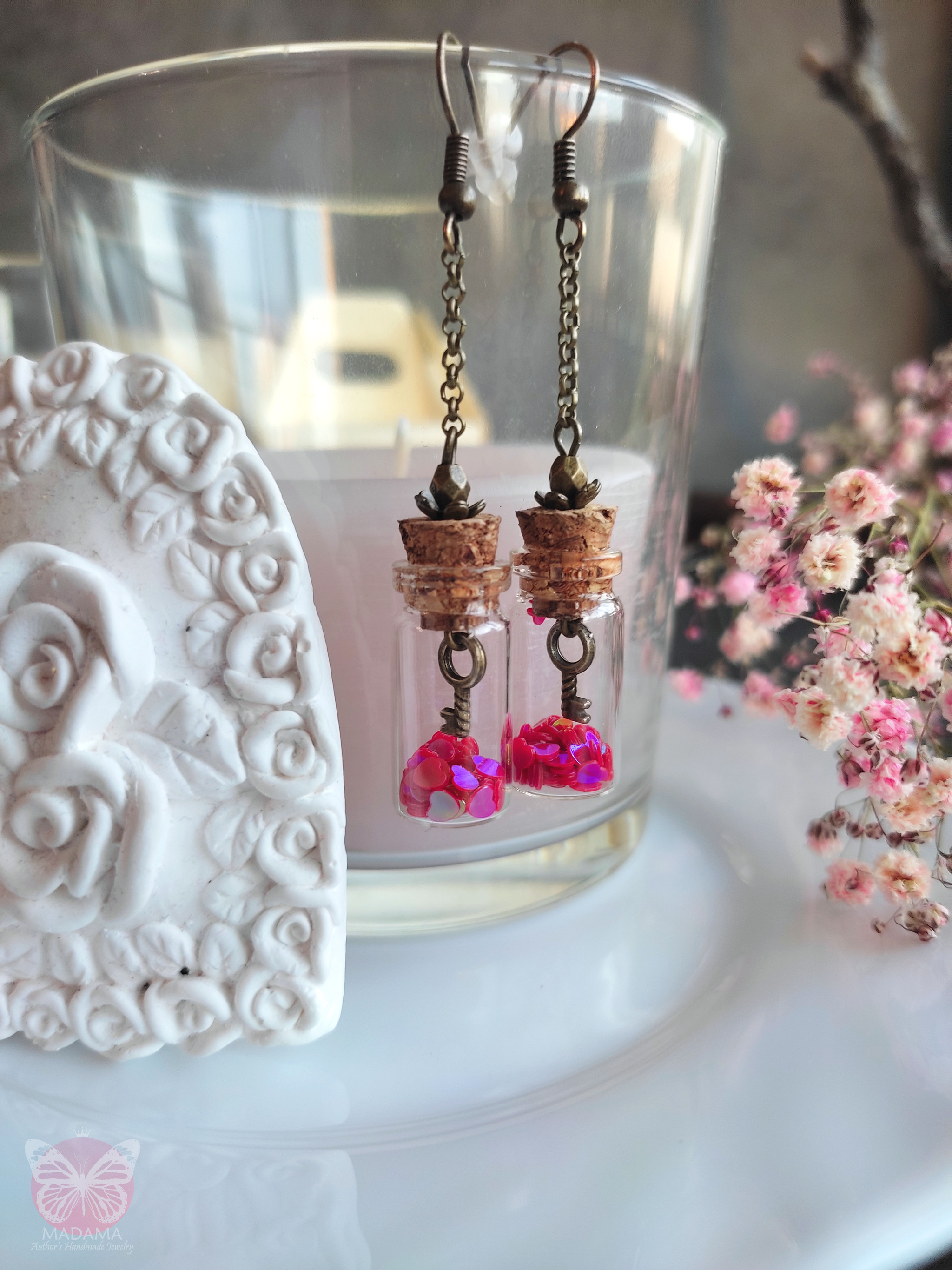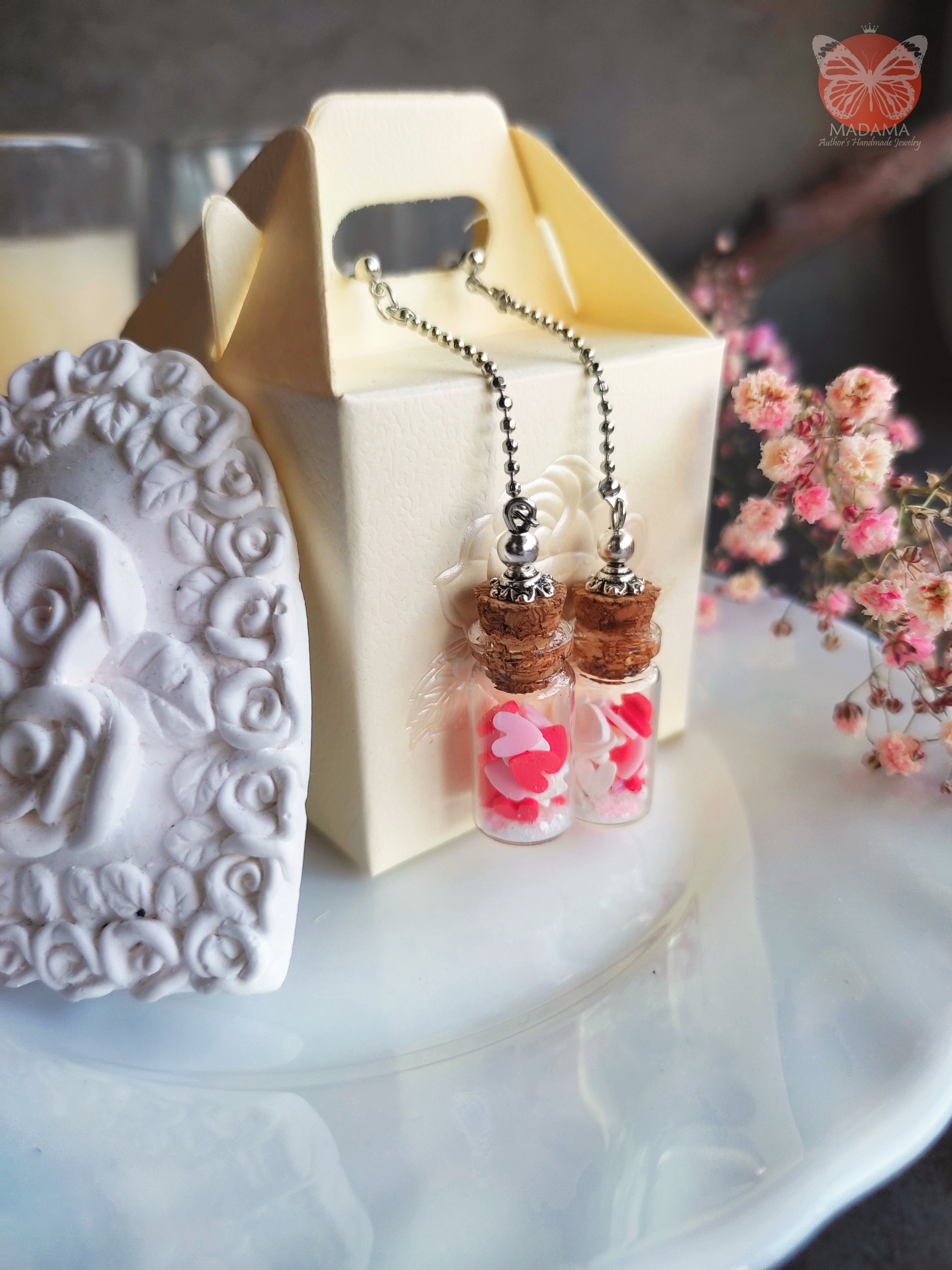 Украшения выполнены из настоящих стеклянных баночек, наполненных декоративными элементами. Фурнитура под бронзу и серебро.