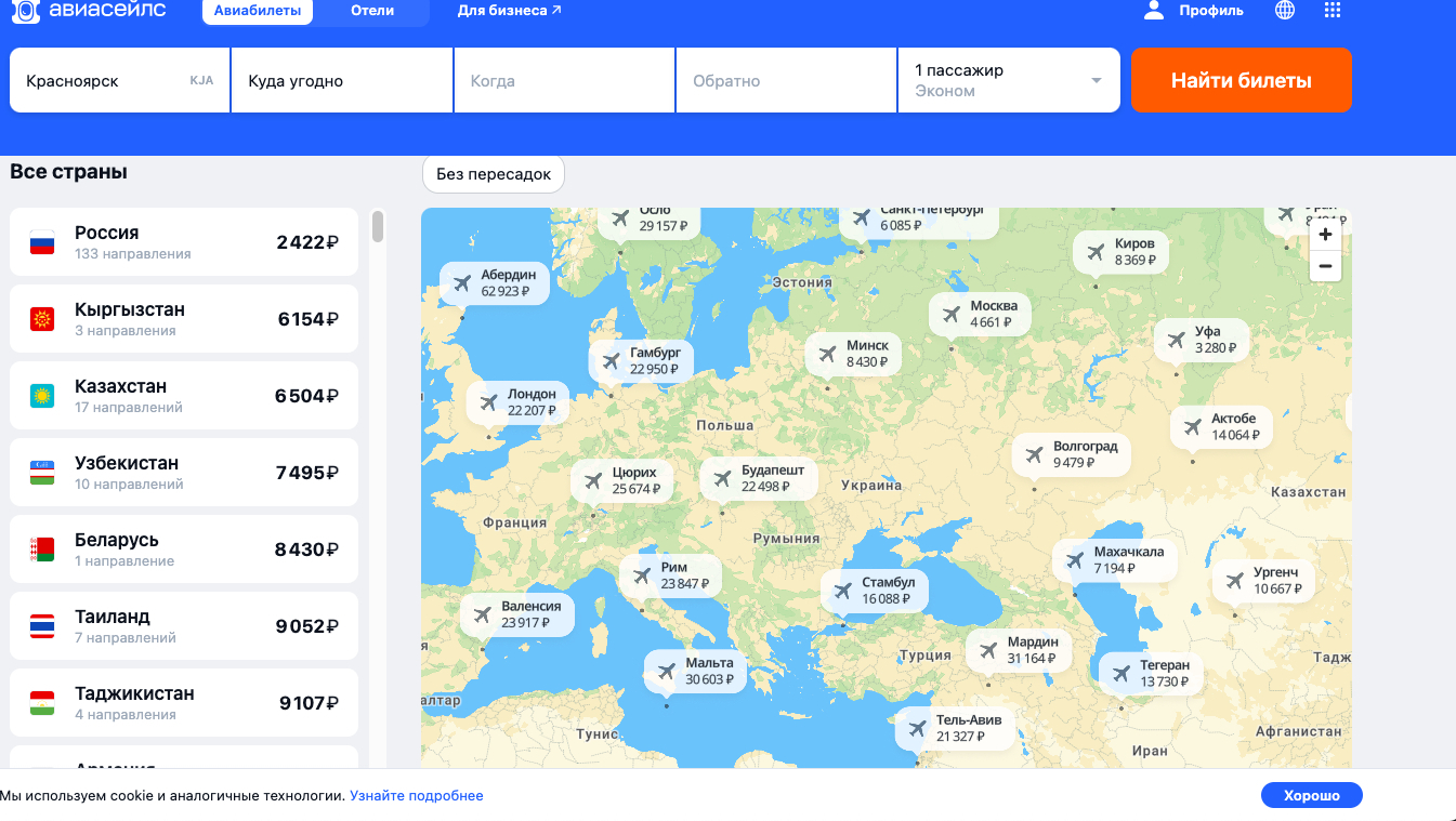тут есть карта вылетов, которая показывает сколько стоит полет из почти любого города в другие города или страны. Вот прямая ссылка на такую карту https://www.aviasales.ru/map ( если есть желание то можно по моей реферальной ссылки https://aviasales.tp.st/ktUBCVbB , но это не главное). Переходите по ссылке пишите город вылета свой и смотрите куда можно в данный момент купить недорогой билет из вашего города. Для примера покажу, как это выглядит если ищешь вылеты из Красноярска:
