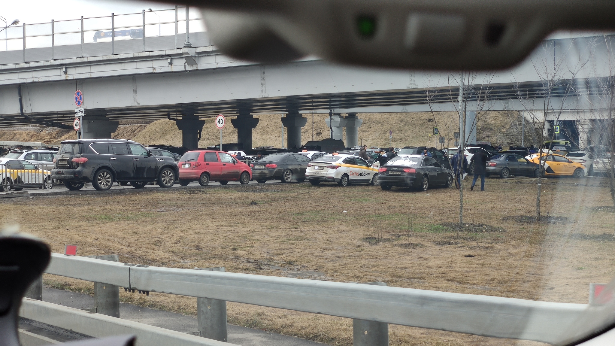 Сначала мелькнула мысль (глупая, наверное) что это участники ДТП съезжают с дороги, дабы не мешать проезду остальных (на этой развязке, естественно никаких парковок не предусмотрено). Но после одной пары машин, туда чуть ли не через одного начали съезжать многие другие. Тут у меня уже был какой-то разрыв шаблона - упорно не понимал, что за тусовка среди дня на такой импровизированной парковке. Протискиваясь дальше, увидел еще более забавную картину - прилежащий тротуар был тоже битком заставлен машинами. Но еще больший прикол был дальше: я насчитал 4 ряда припаркованных на прямо на проезжей части автомобилей, оставивших полтора (а по сути всего один) ряда для проезда остальных.