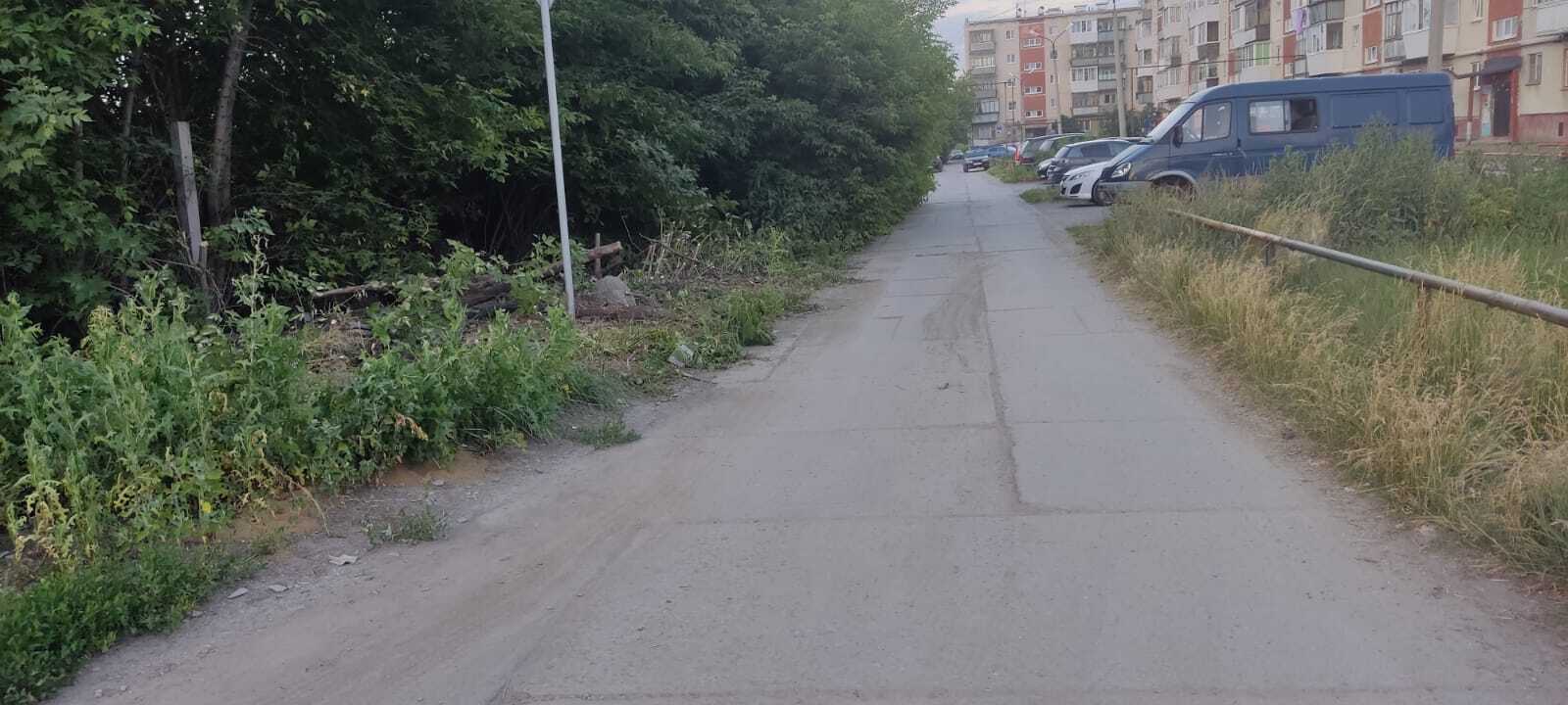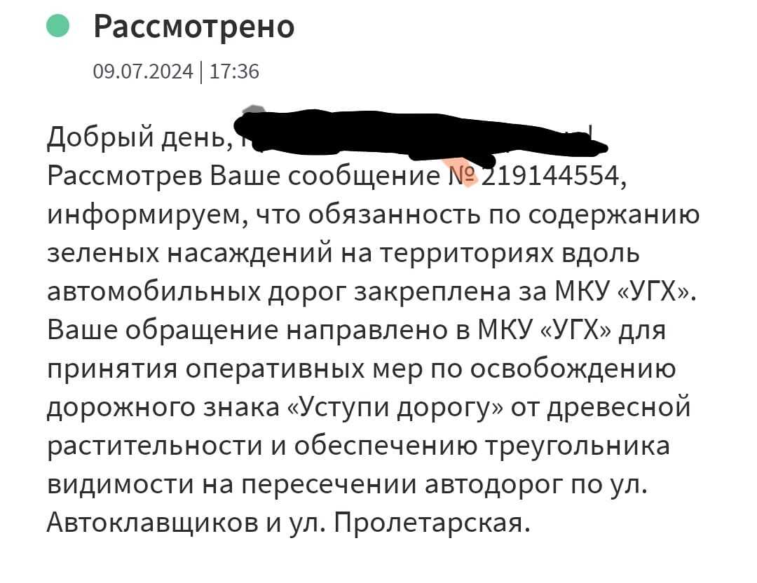 Пояснение, если вдруг кому надо, справа от дороги одноэтажная застройка, первая часть, где зарослей поменьше, относится к частным домам и там мало-мальски с дороги убирают. А вот где начинается полный ппц, там дома на несколько квартир (бараки) и они обслуживаются управляющей компанией. Видимо из-за того что я написала про знак мое обращение передали не в УК, а в УГХ.
