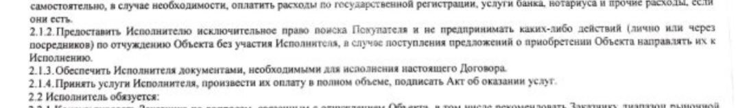 «Предоставить Исполнителю исключительное право поиска Покупателя и не предпринимать каких-либо действий (лично или через посредников) по отчуждению Объекта без участия Исполнителя, в случае поступления предложений о приобретении Объекта, направить их к Исполнителю».