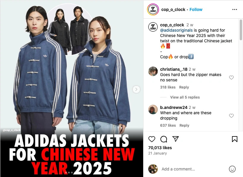В Январе сообщество streetwear взорвал выпуск новой спортивной куртки Adidas Originals Tang в честь Лунного Нового года-2025 в Китае. Пользователи массово искали способы как её купить, однако куртка была доступна только в Китае.