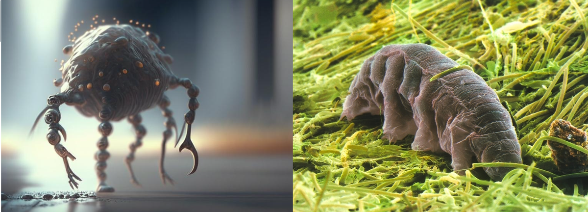 Тихоходка в представлении нейросети и реальная фотография (sem). Промт: Тихоходка. Микроорганизм. Стиль 3D рендер