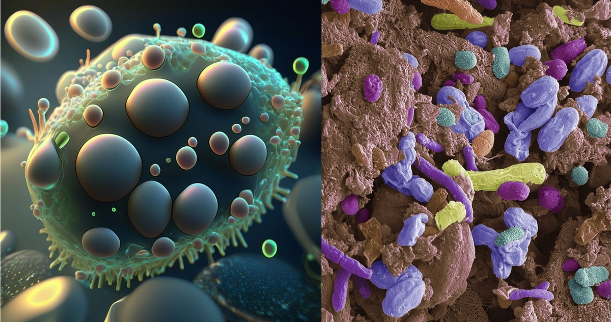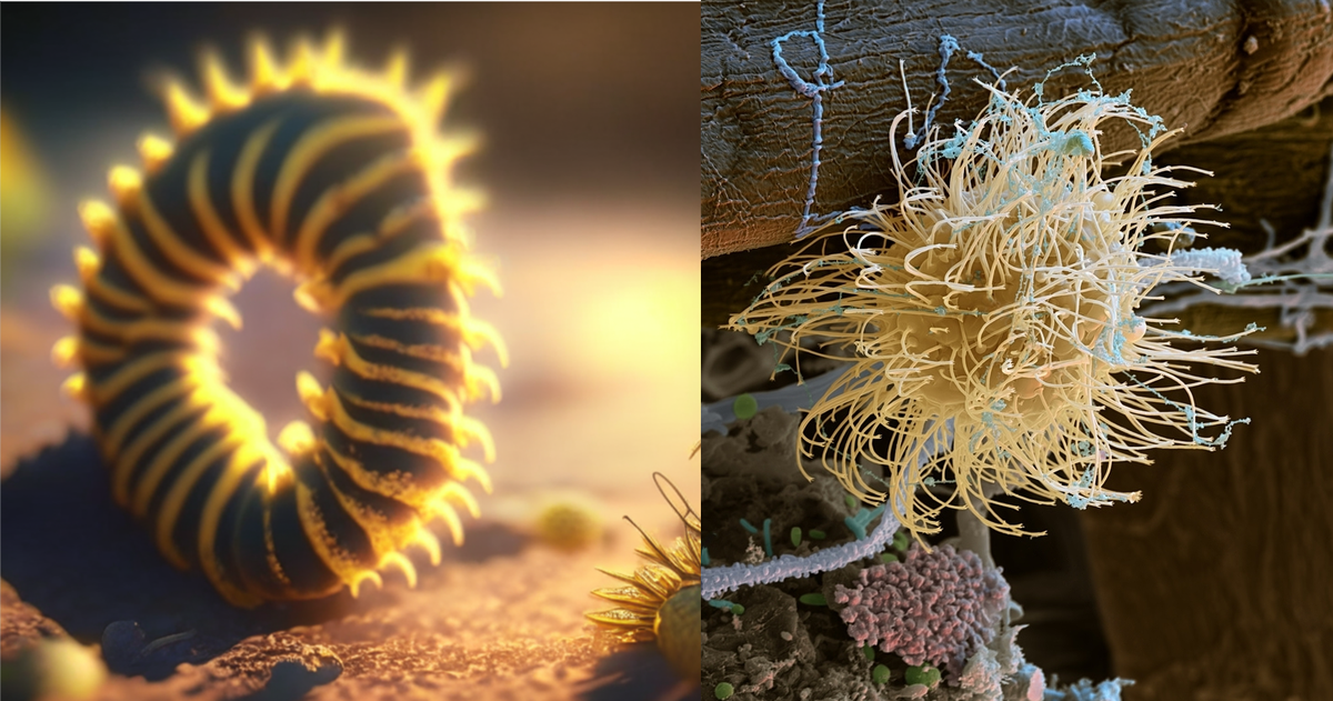Бактерии в представлении нейросети и реальная фотография (sem). Промт: Бактерии. Микроорганизм. Стиль: 3D рендер